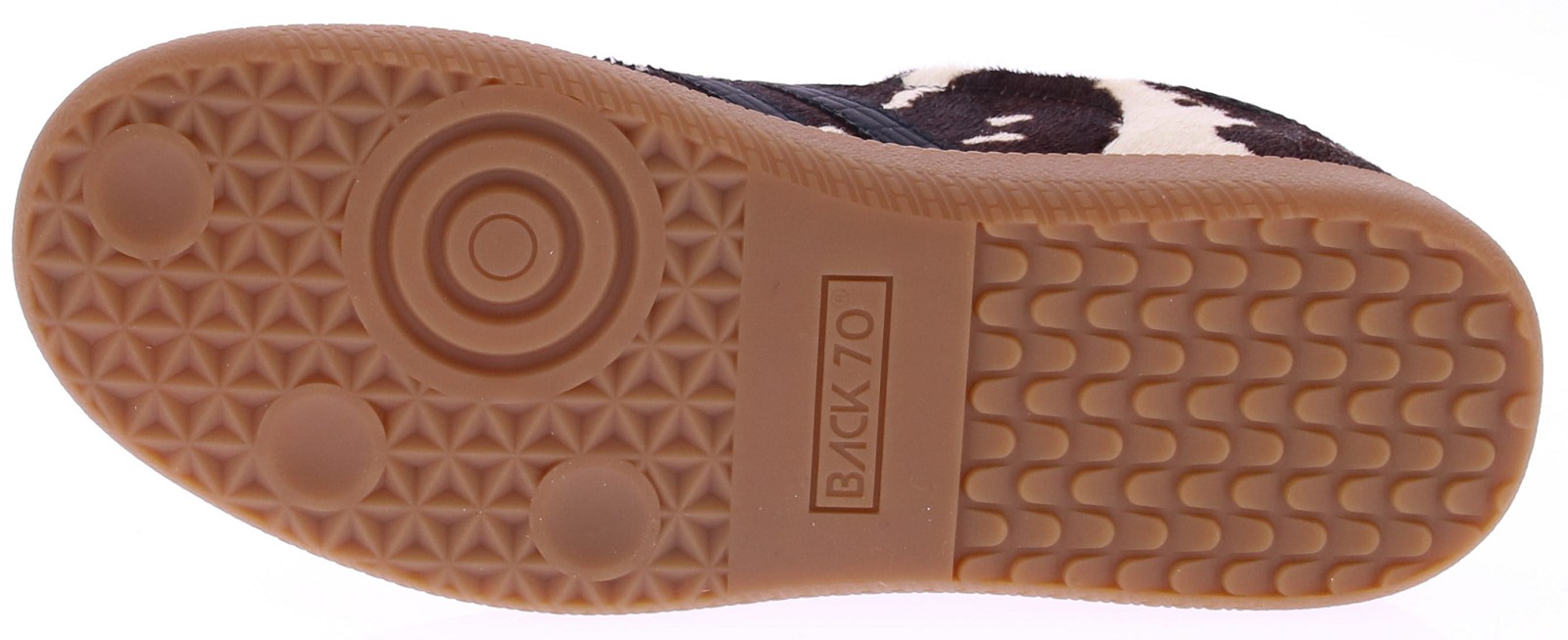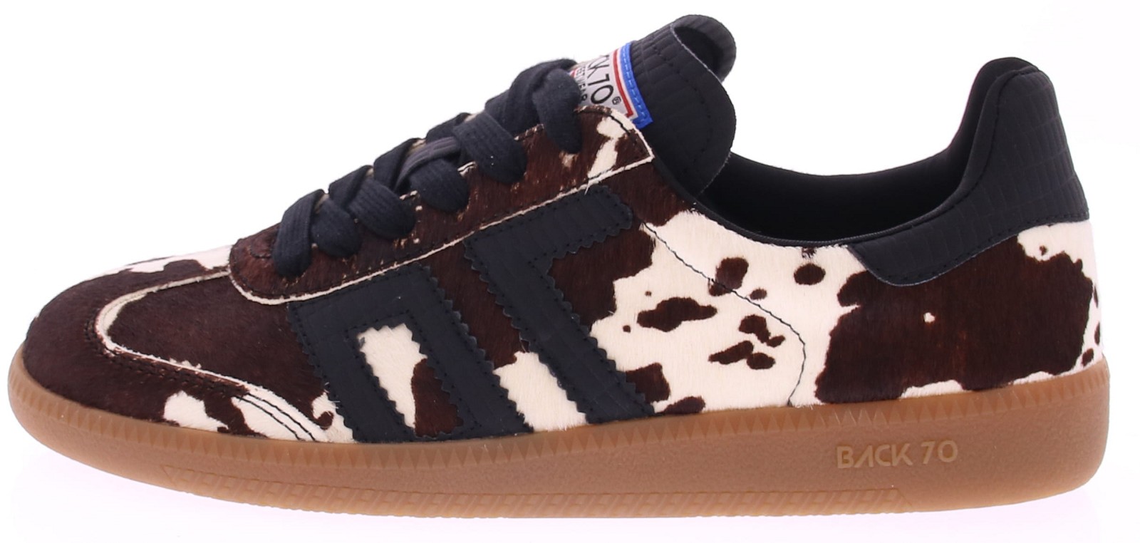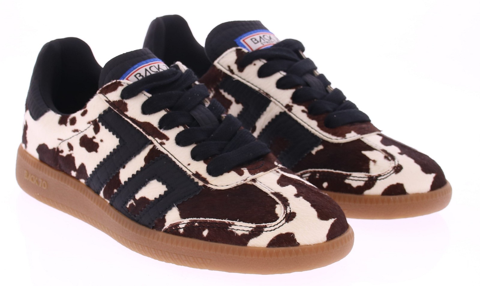 Koeienprint sneaker van Back70 voor dames. Deze retro dames-sneaker van Back70 de CLOUD CL10 in Zwart met wit heeft een honingkleurige zool en een zwart logo en hielstuk. De zool is uitneembaar. Stijlvol, comfortabel en perfect voor elke casual outfit!