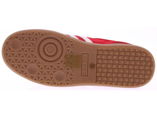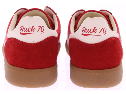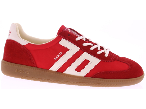 Rood suede met satijn sneaker met witte accenten van Back70 voor dames. Deze retro dames-sneaker van Back70 de Ghost c26-117 in rood met wit heeft een honingkleurige zool en een wit leren logo en hielstuk. De zool is vervangbaar voor uw eigen persoonlijke inlegzool. Perfect voor elke casual outfit. Kijk ook eens bij onze andere modellen van Back70