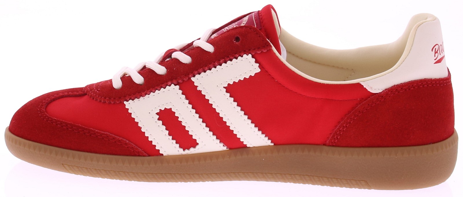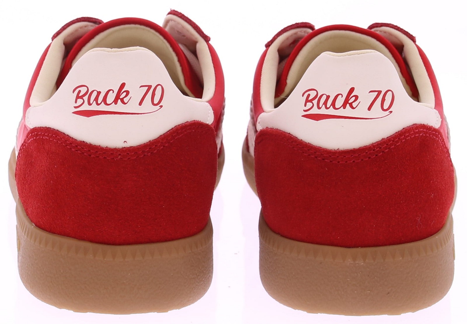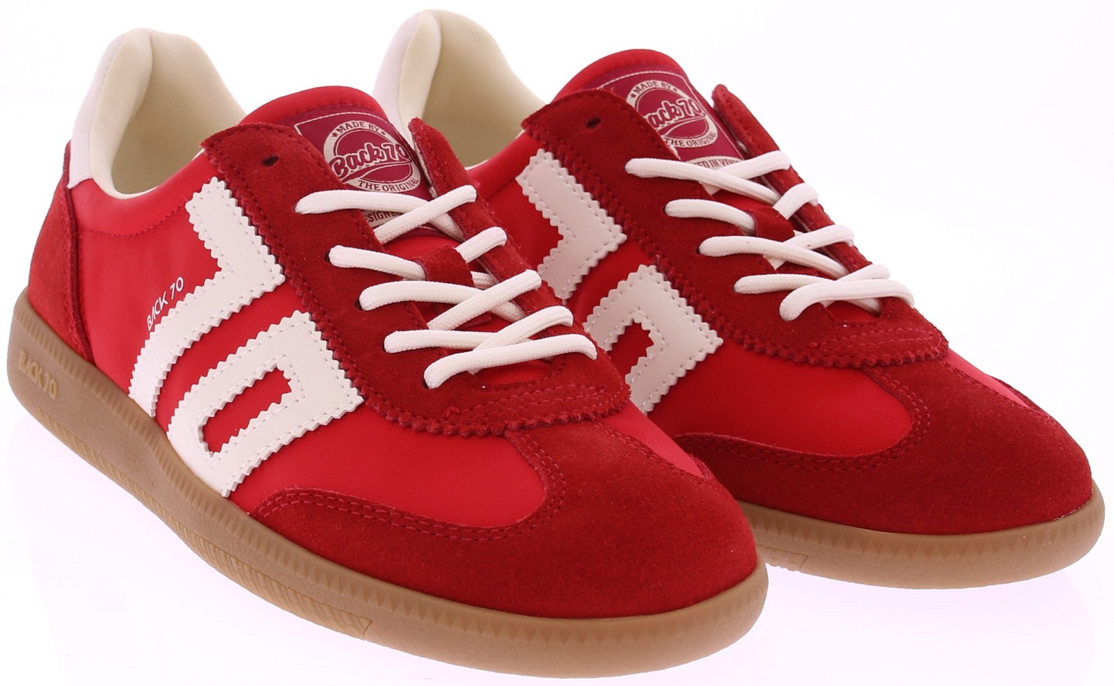 Rood suede met satijn sneaker met witte accenten van Back70 voor dames. Deze retro dames-sneaker van Back70 de Ghost c26-117 in rood met wit heeft een honingkleurige zool en een wit leren logo en hielstuk. De zool is vervangbaar voor uw eigen persoonlijke inlegzool. Perfect voor elke casual outfit. Kijk ook eens bij onze andere modellen van Back70