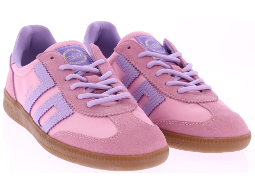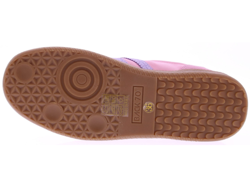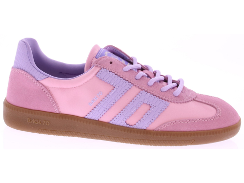 Roze suède met satijn sneaker met lila accenten van Back70 voor dames. Deze retro dames-sneaker van Back70 de Ghost c26-105 in roze met lichtblauw heeft een honingkleurige zool en een lichtblauw leren logo en hielstuk. De zool is vervangbaar voor uw eigen persoonlijke inlegzool. Perfect voor elke casual outfit. Kijk ook eens bij onze andere modellen van Back70