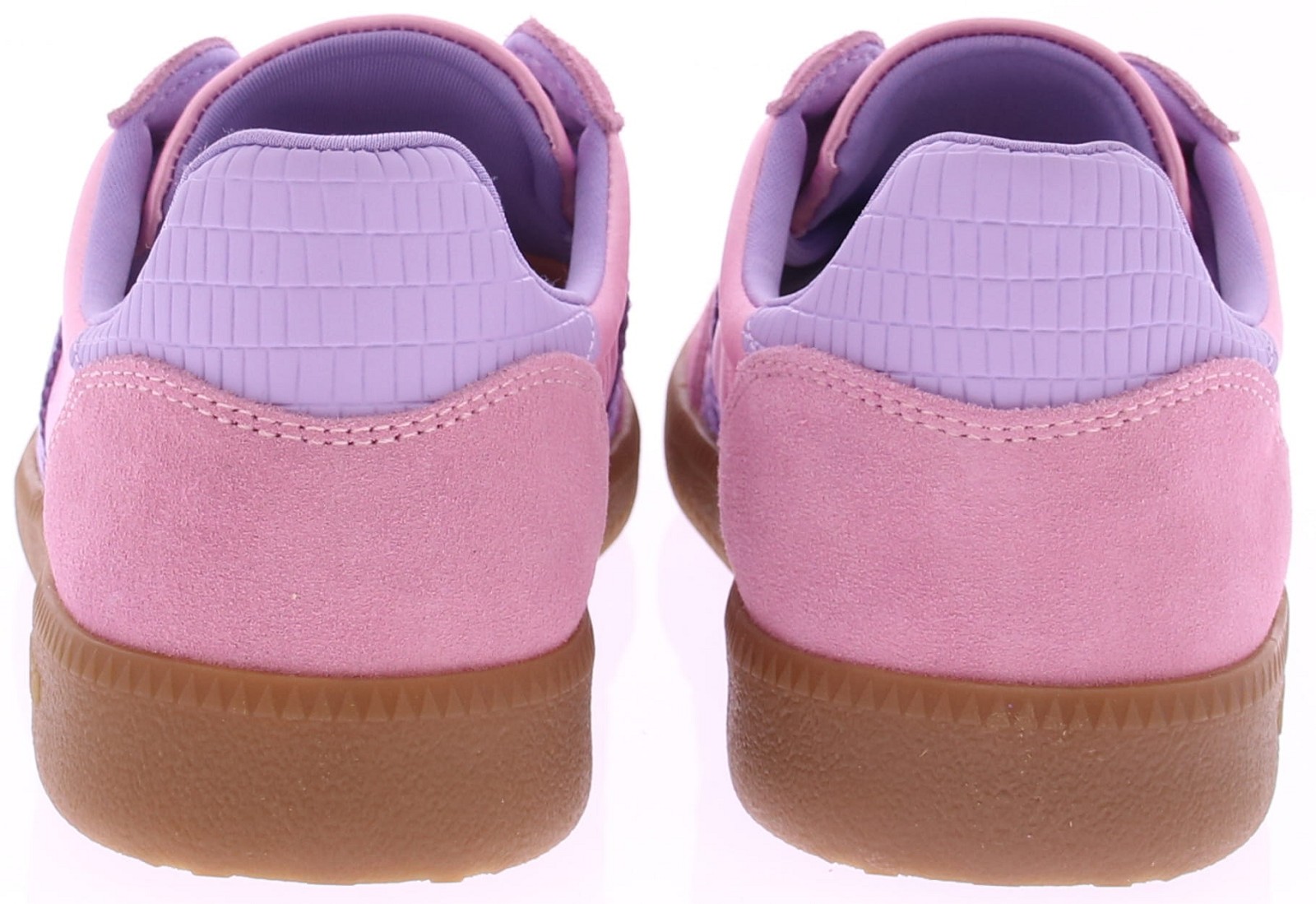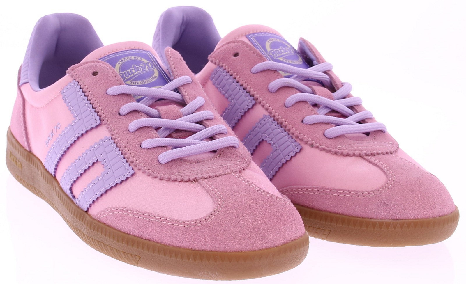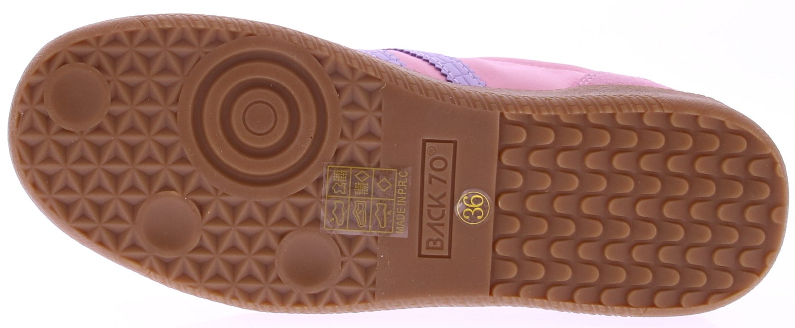 Roze suède met satijn sneaker met lila accenten van Back70 voor dames. Deze retro dames-sneaker van Back70 de Ghost c26-105 in roze met lichtblauw heeft een honingkleurige zool en een lichtblauw leren logo en hielstuk. De zool is vervangbaar voor uw eigen persoonlijke inlegzool. Perfect voor elke casual outfit. Kijk ook eens bij onze andere modellen van Back70