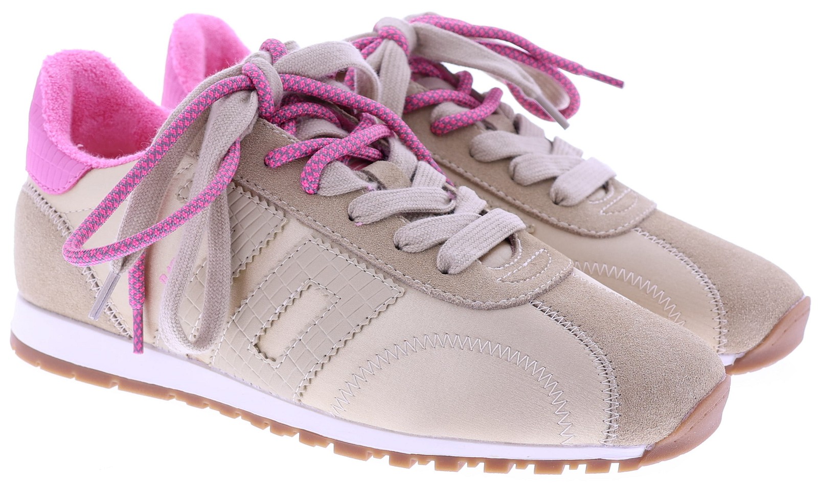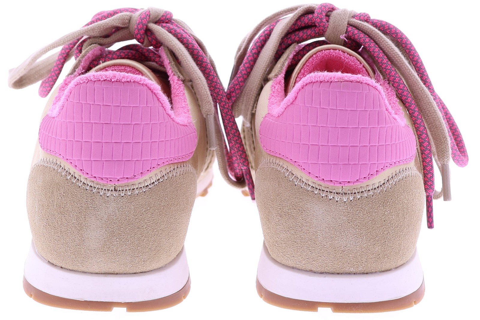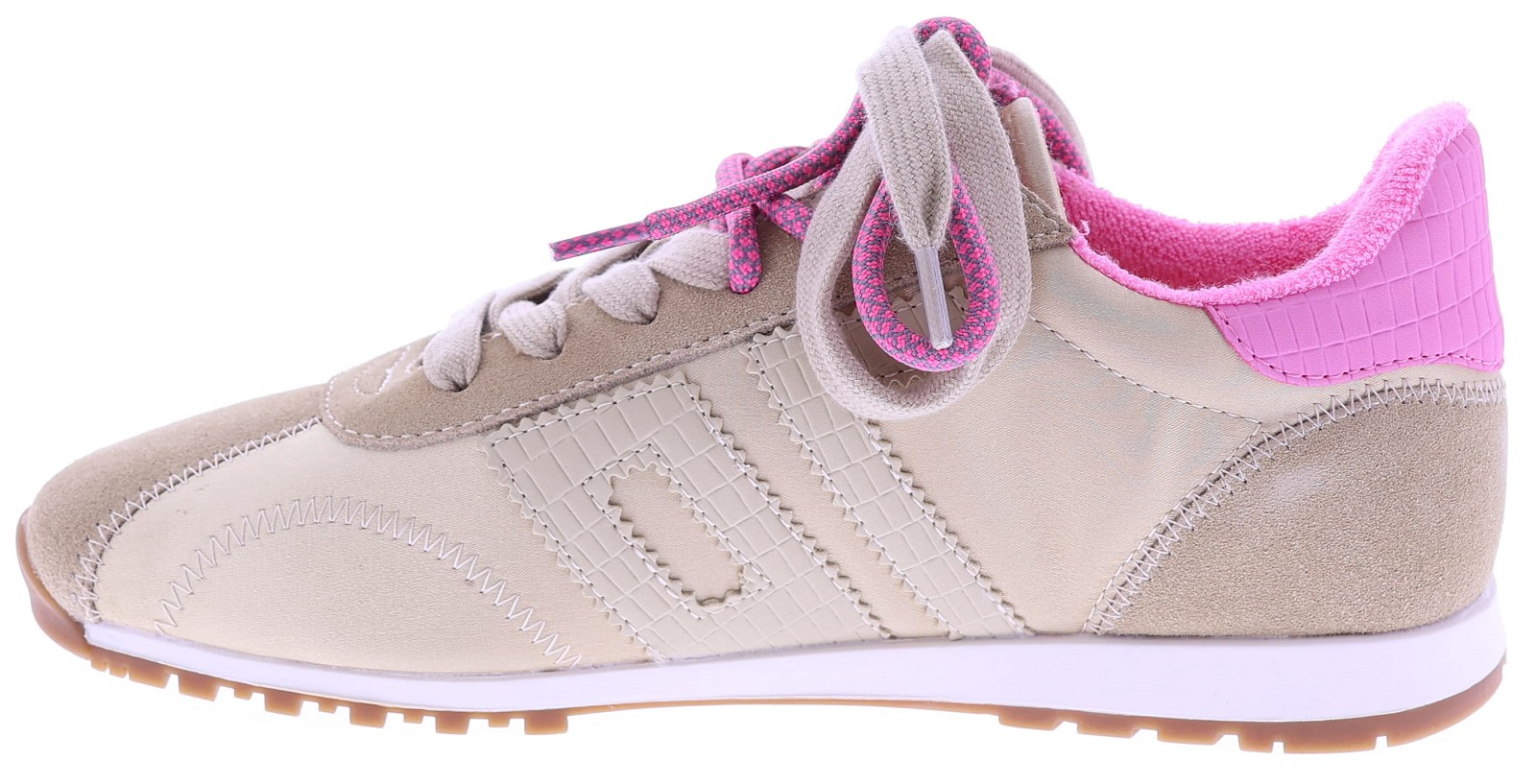 Beige suède met satijn dames sneaker van Back70. Dit model Asian G26-205 is uitgevoerd in een combinatie van suède en satijn, met een roze detail op de hiel en een extra roze veter voor een speels accent. Het model heeft een uitneembaar voetbed voor uw eigen persoonlijke inlegzool en een rubberen zool voor dagelijks gebruik. Ontdek ook de andere dames sneakers van Back70 bij Klijsen.