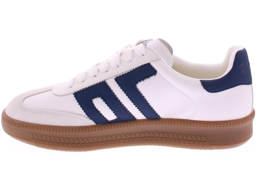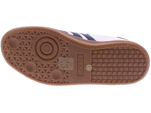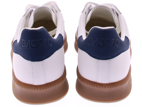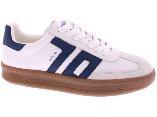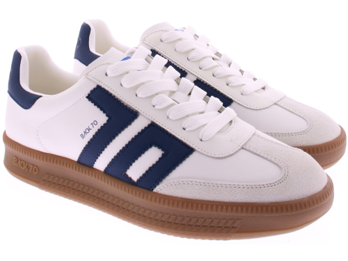 Donkerblauw met wit leren sneaker van Back70 voor heren. Deze retro sneaker van Back70 de Double V26-02 in wit met donkerblauw heeft een honingkleurige zool en een leren logo en hielstuk. De zool is vervangbaar voor uw eigen persoonlijke inlegzool. Perfect voor elke casual outfit. Kijk ook eens bij onze andere modellen van Back70.