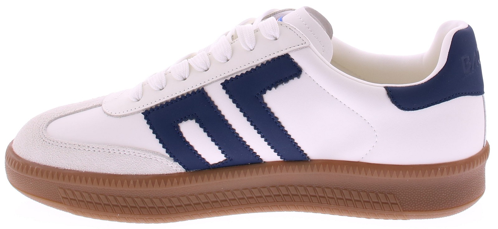 Donkerblauw met wit leren sneaker van Back70 voor heren. Deze retro sneaker van Back70 de Double V26-02 in wit met donkerblauw heeft een honingkleurige zool en een leren logo en hielstuk. De zool is vervangbaar voor uw eigen persoonlijke inlegzool. Perfect voor elke casual outfit. Kijk ook eens bij onze andere modellen van Back70.