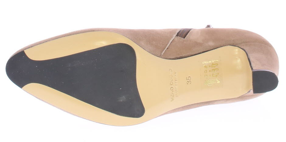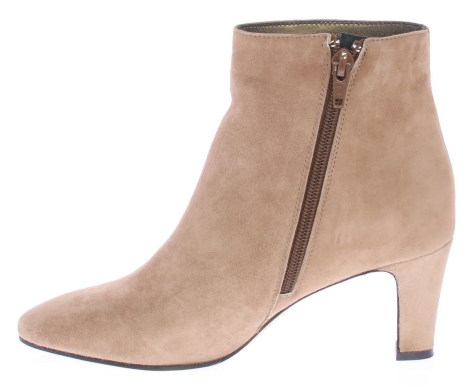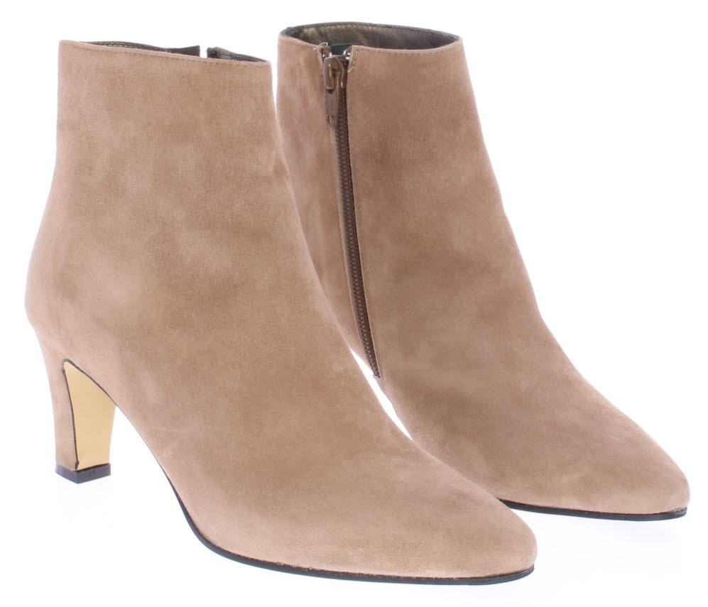Licht beige suede dames enkellaars van Cypres. Mooi basic laarsje op een 6 cm beklede hak. Ook gekleed te dragen bij een jurkje of rokje.