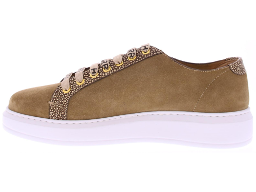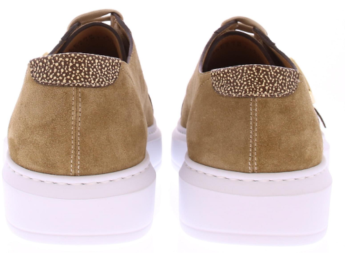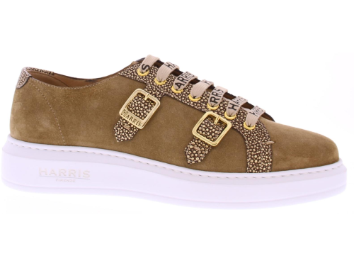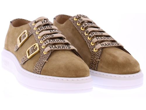 Harris sneaker in beige suede met beige rogprint leer afgezet en 2 gespen op de zijkant. De schoen heeft een wit rubber zool.