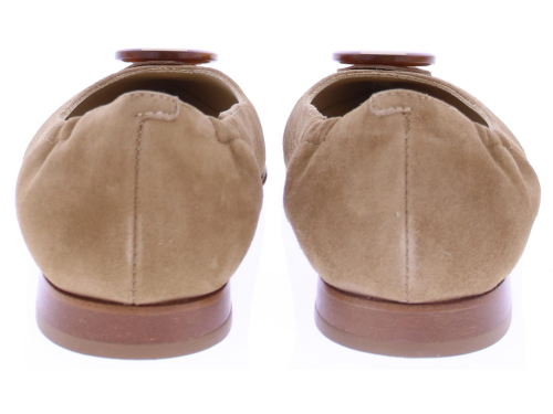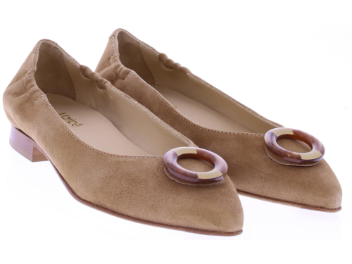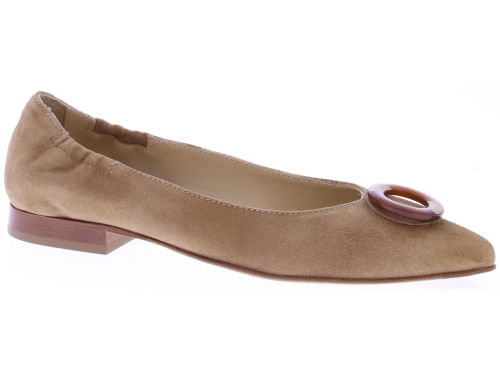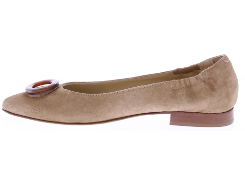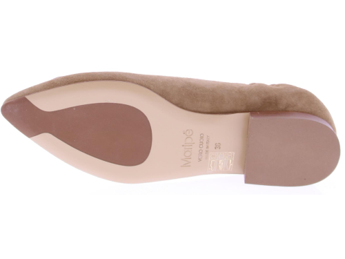Beige suede dames ballerina van Maripe. De ballerina heeft een spitse neus, met op de wreef een sierlijke half bruin kunstof, half goudkleurige garnering. In de hielband zit elastiek voor extra draaggemak. De voering is van leer. De hakhoogte 2 cm.
