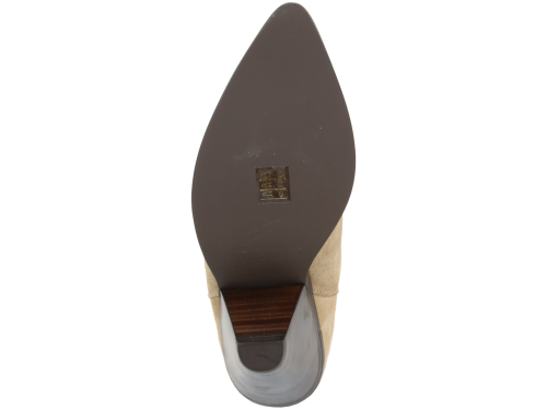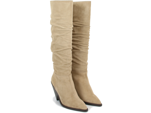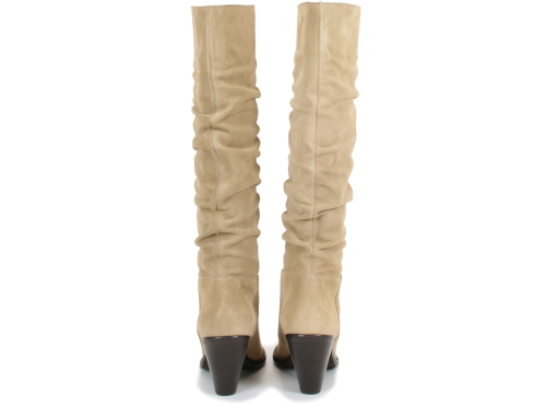 Beige suede lange dames laars van Toral. De laars heeft een geplooide schacht waardoor er een nochalant afzak idee ontstaat en een modische conische hak van 6 cm.