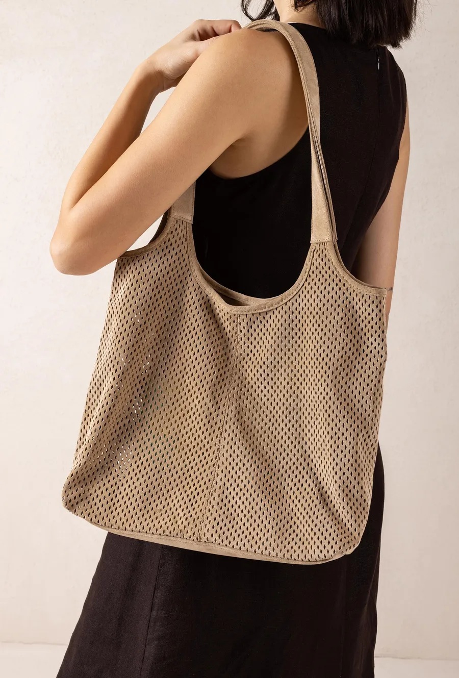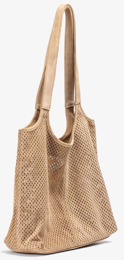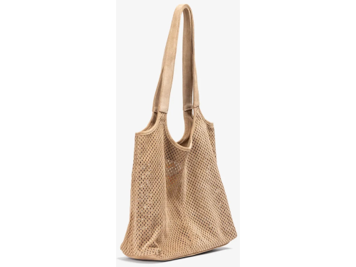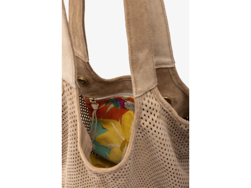 Beige suède damestas van Unisa, model Zluis. Deze ruime shopper is uitgevoerd in zacht, geperforeerd suède en heeft een casual-chique uitstraling die moeiteloos past bij iedere zomerse outfit. De lange schouderbanden zorgen voor een comfortabele draaghoogte, terwijl het soepele materiaal de tas een ontspannen look geeft. Afmetingen: 28 cm x 29 cm x 14 cm. Een stijlvolle tas die perfect combineert met de bijpassende schoenen uit onze Unisa-collectie.