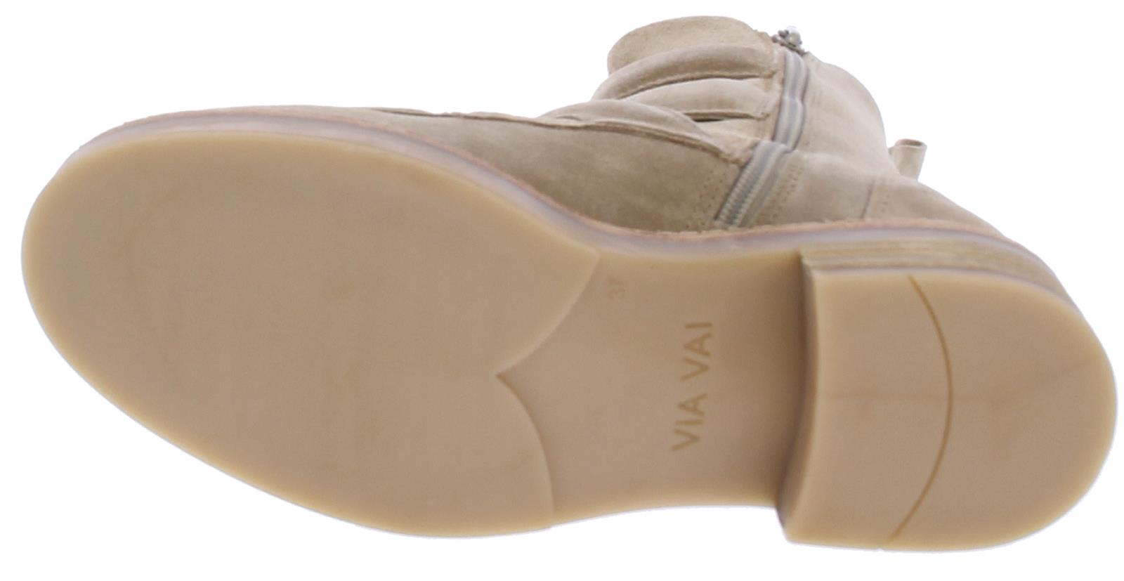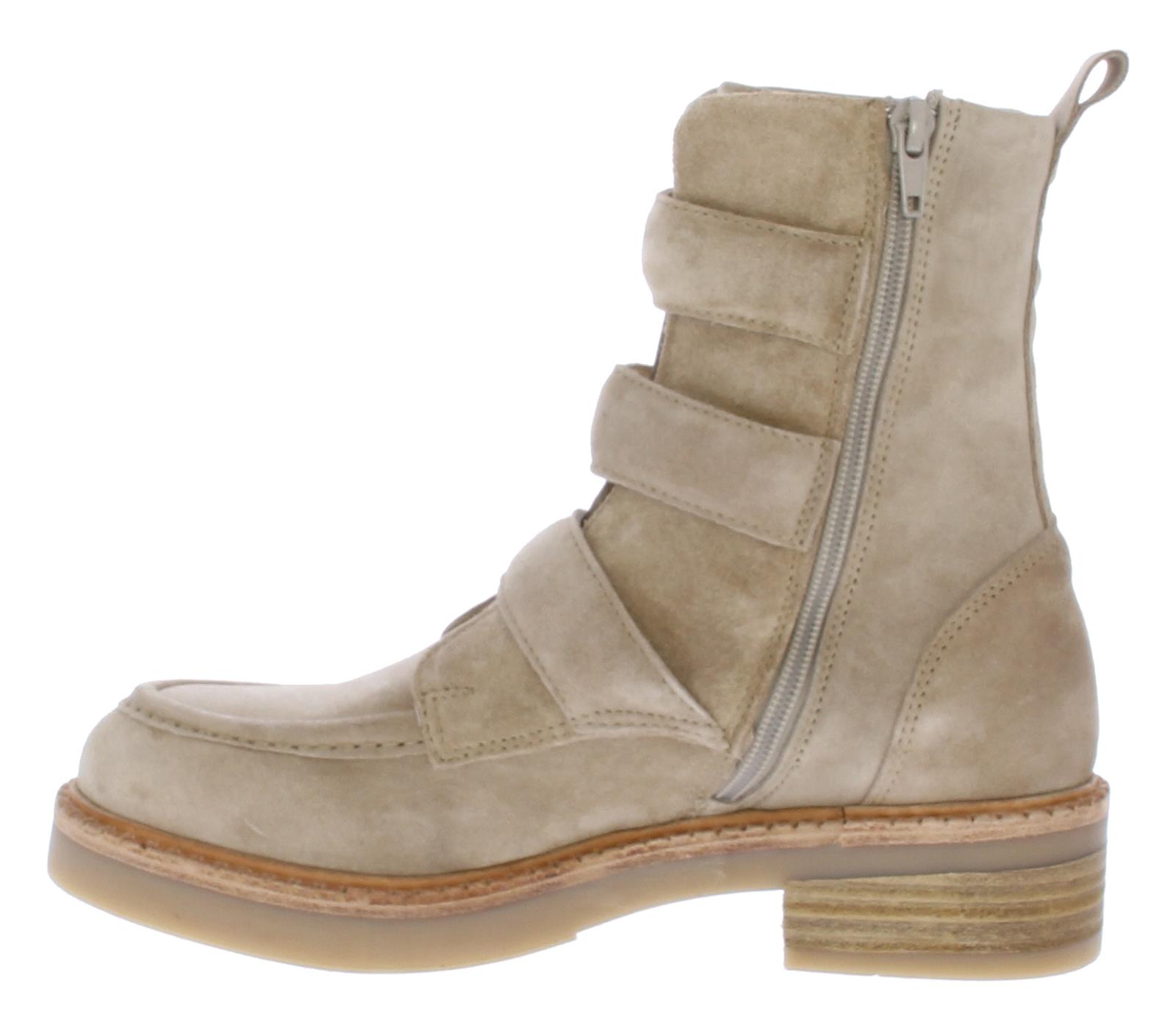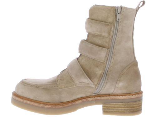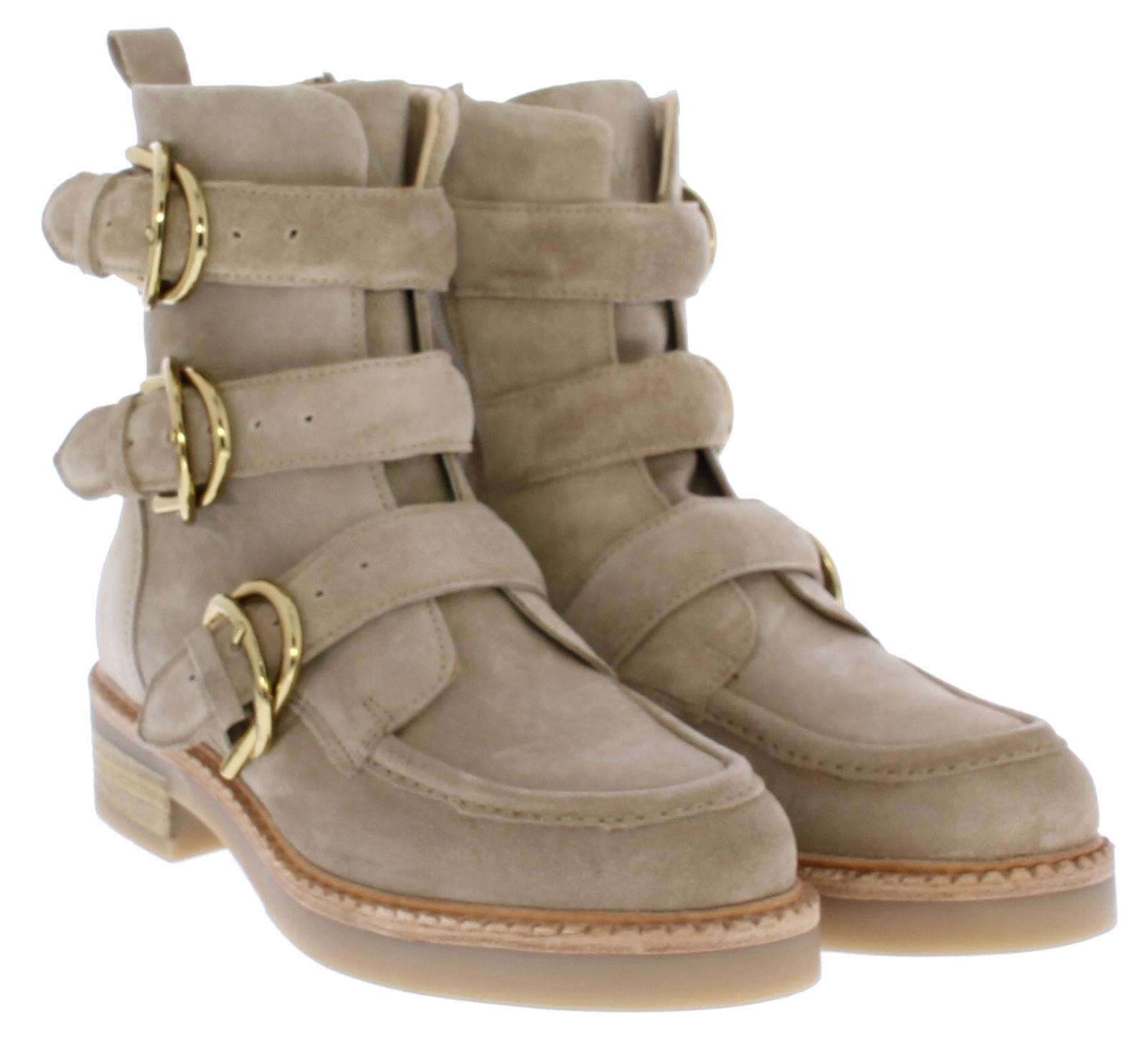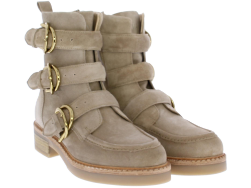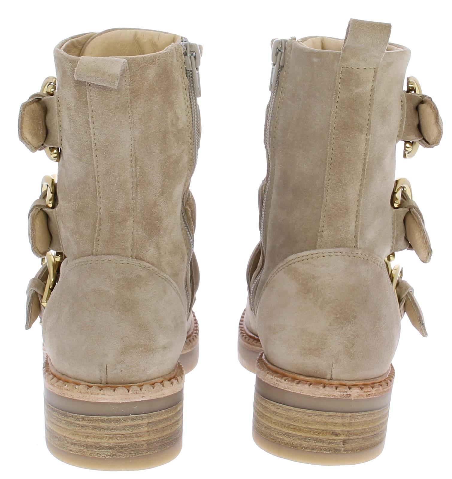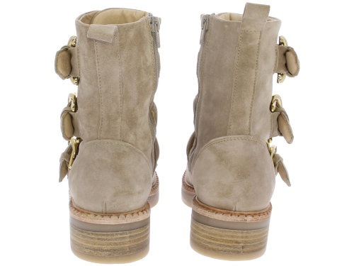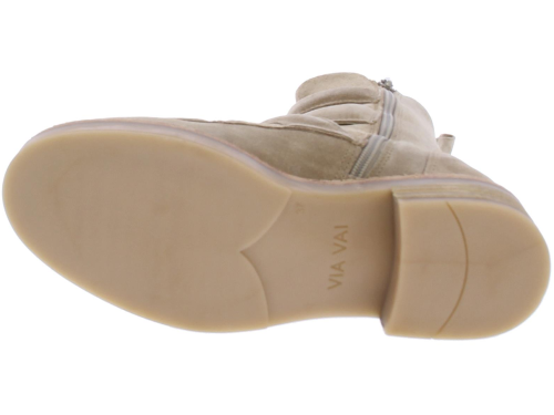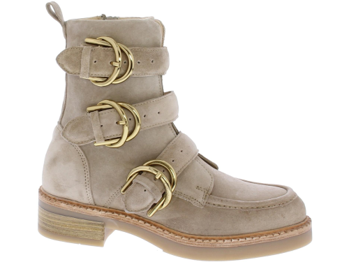 Beige suede dames enkellaars van Via Vai. Deze schoen is afgewerkt met 3 luxe goudkleurige gespen, een rits en sierrand op de voorvoet. Het onderwerk is een combinatie van rubber met leer. De binnenzool is uitneembaar.