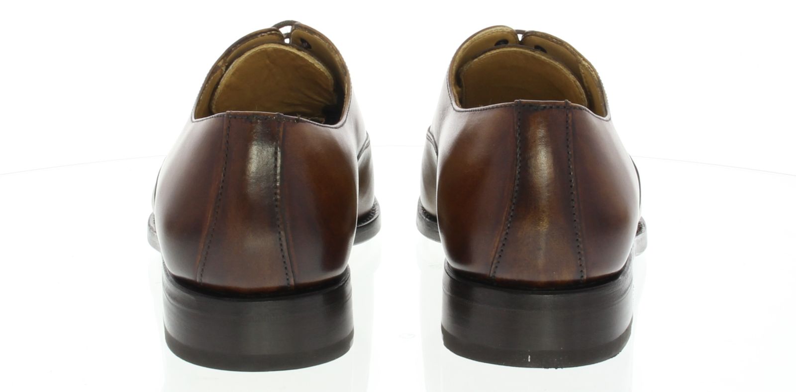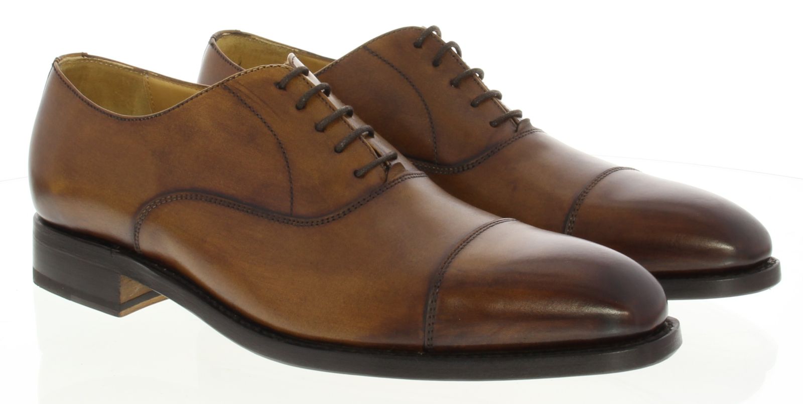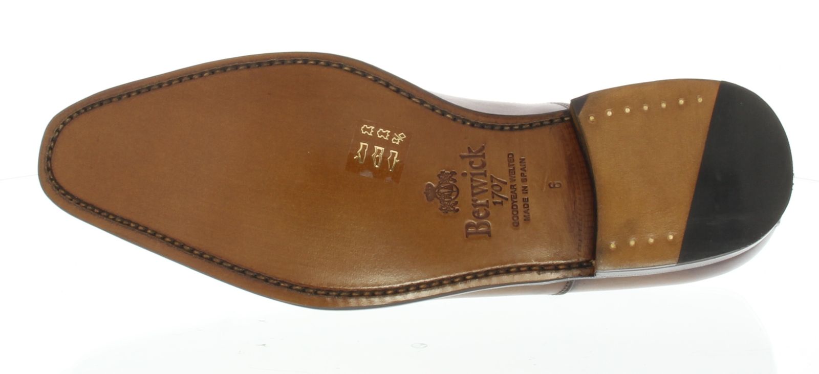 Cognac leren heren veterschoen van Berwick. De schoen heeft een neusnaad, is gevoerd met leer en heeft een leren zool.