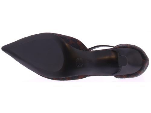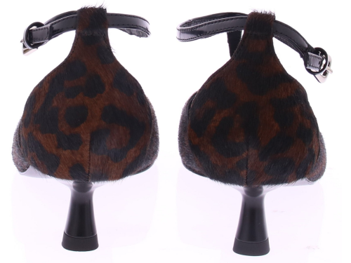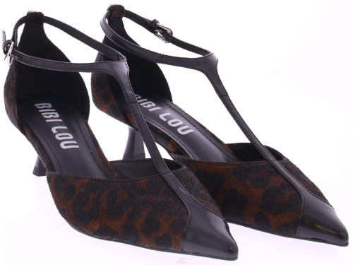 Bruin met zwarte dames pump van Bibi Lou. Uitgevoerd in ponyhair met panterprint en zwart leren accenten. Het queeniehakje is 4 cm hoog en hij heeft een dunne leren zool met een rubberen inzet. Het T-bandje zorgt voor een extra vrouwelijke touch. En sluit met een zilverkleurig gespje.