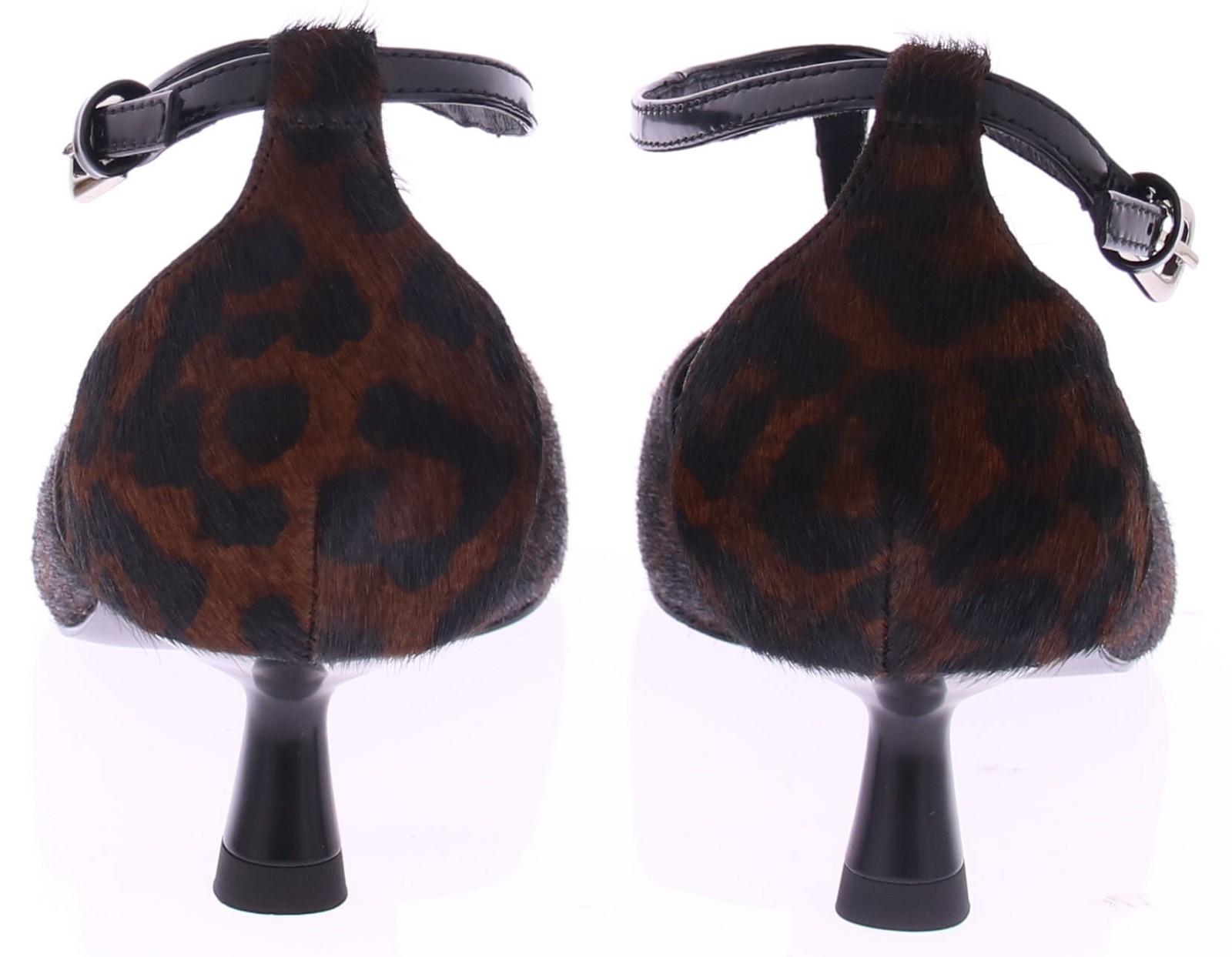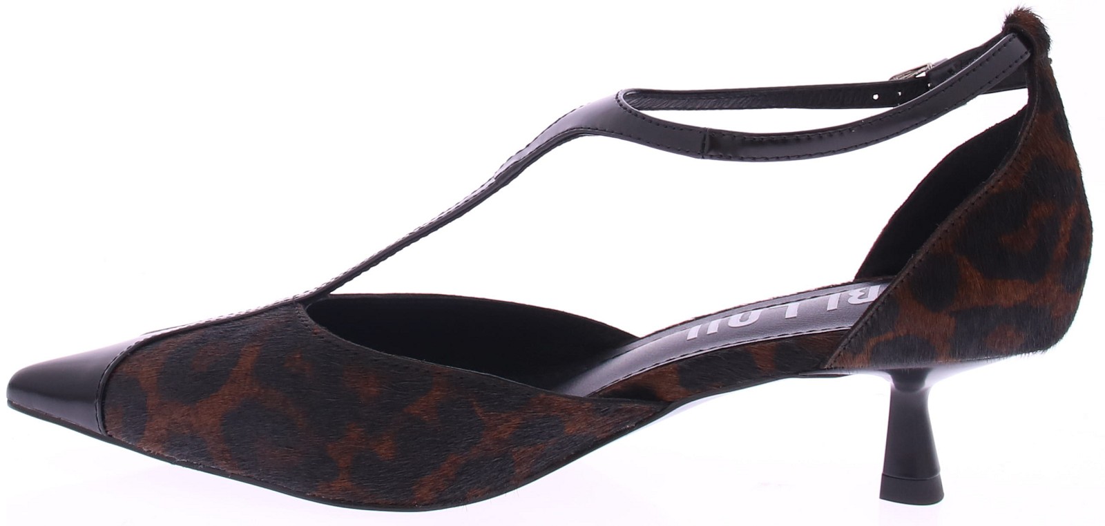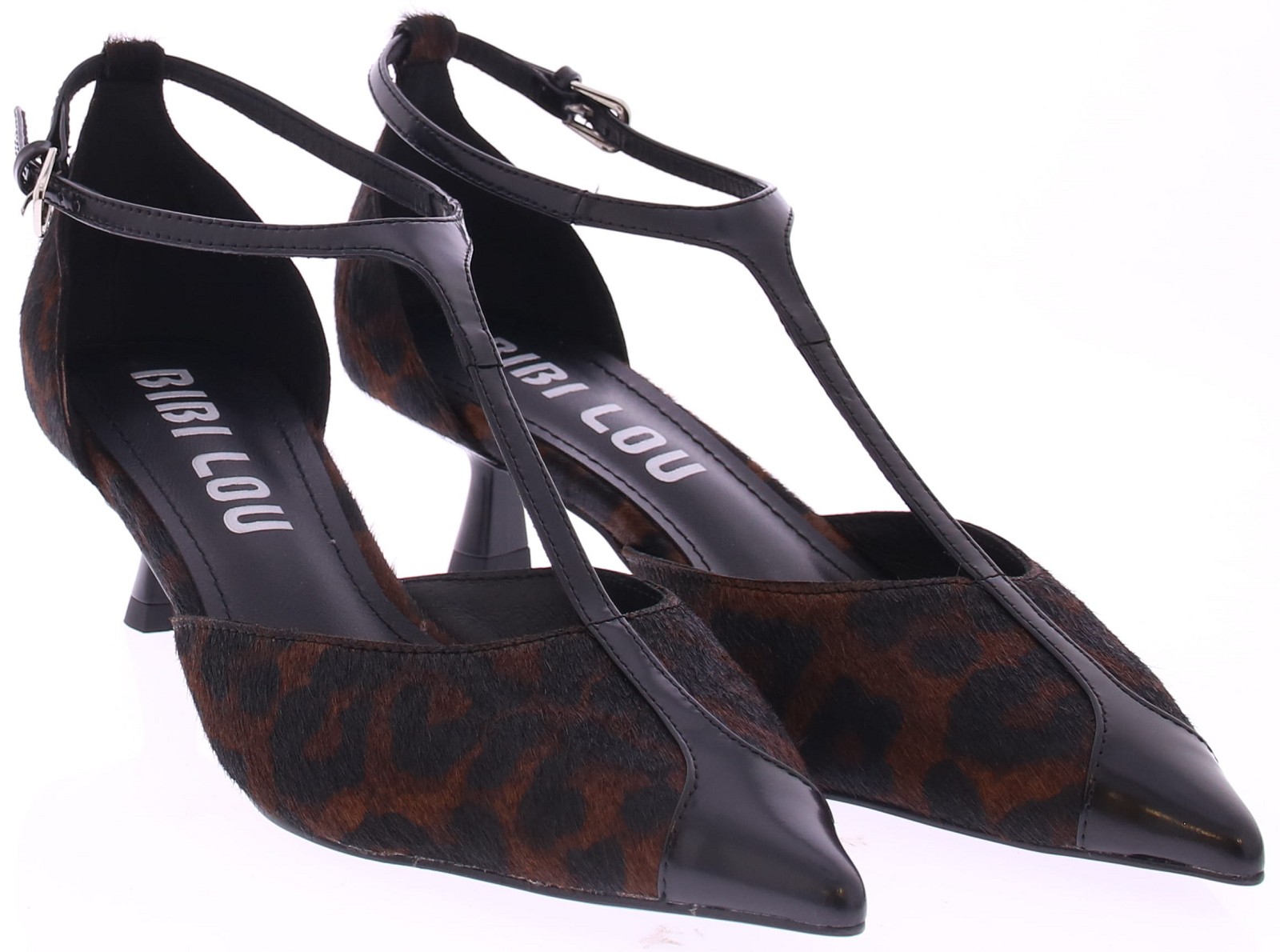 Bruin met zwarte dames pump van Bibi Lou. Uitgevoerd in ponyhair met panterprint en zwart leren accenten. Het queeniehakje is 4 cm hoog en hij heeft een dunne leren zool met een rubberen inzet. Het T-bandje zorgt voor een extra vrouwelijke touch. En sluit met een zilverkleurig gespje.