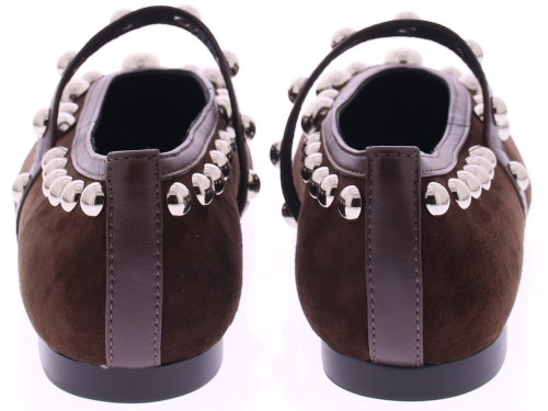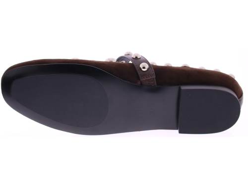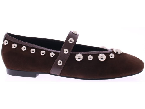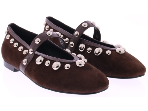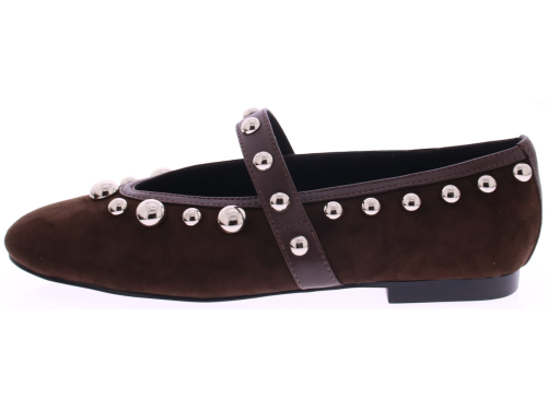 Donkerbruin suede dames ballerina van Bibi Lou, 717Z30VK. Uitgevoerd met leren biezen en zilverkleurige bolletjes. De voering is van leer. En de zool van dun rubber.