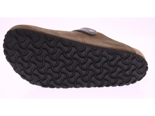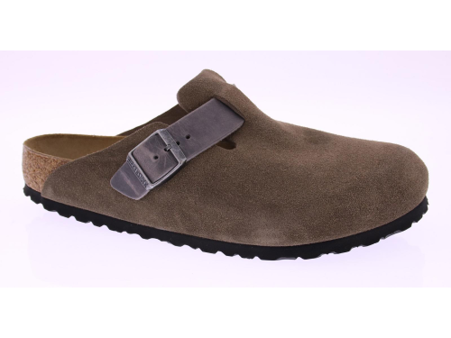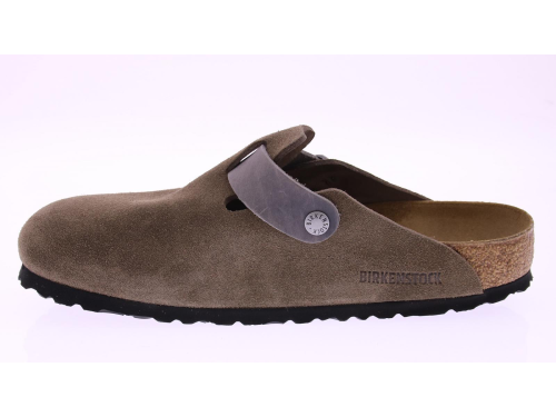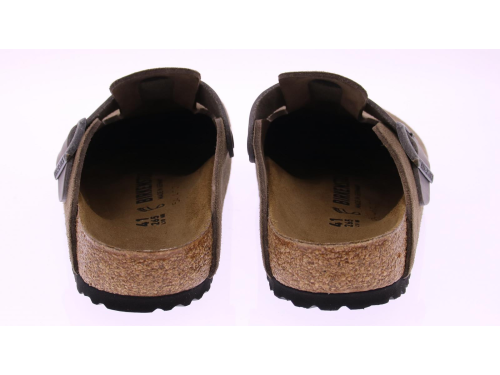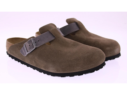 Bruin suède heren muil van Birkenstock. Deze muil "Boston" congrete grey heeft een bovenwerk van super zacht suède met een verstelbaar bandje in de zelfde kleur khaki. Het anatomische gevormde voetbed zorgt voor extra comfort. Een klassieker die het hele jaar door gedragen kan worden.