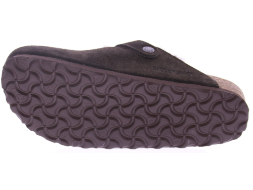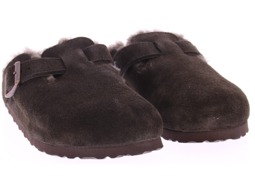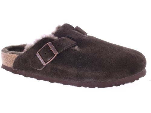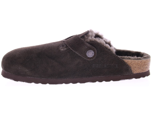 Donkerbruin suede dames muil van Birkenstock. Deze muil "Boston Shearling Mocca" heeft een bovenmateriaal van super zacht suede met een verstelbaar bandje met mat rosè gespje en is gevoerd met een zachte sheepskin. Het anatomische gevormde voetbed zorgt voor extra comfort. Een klassieker die het hele jaar door gedragen kan worden.