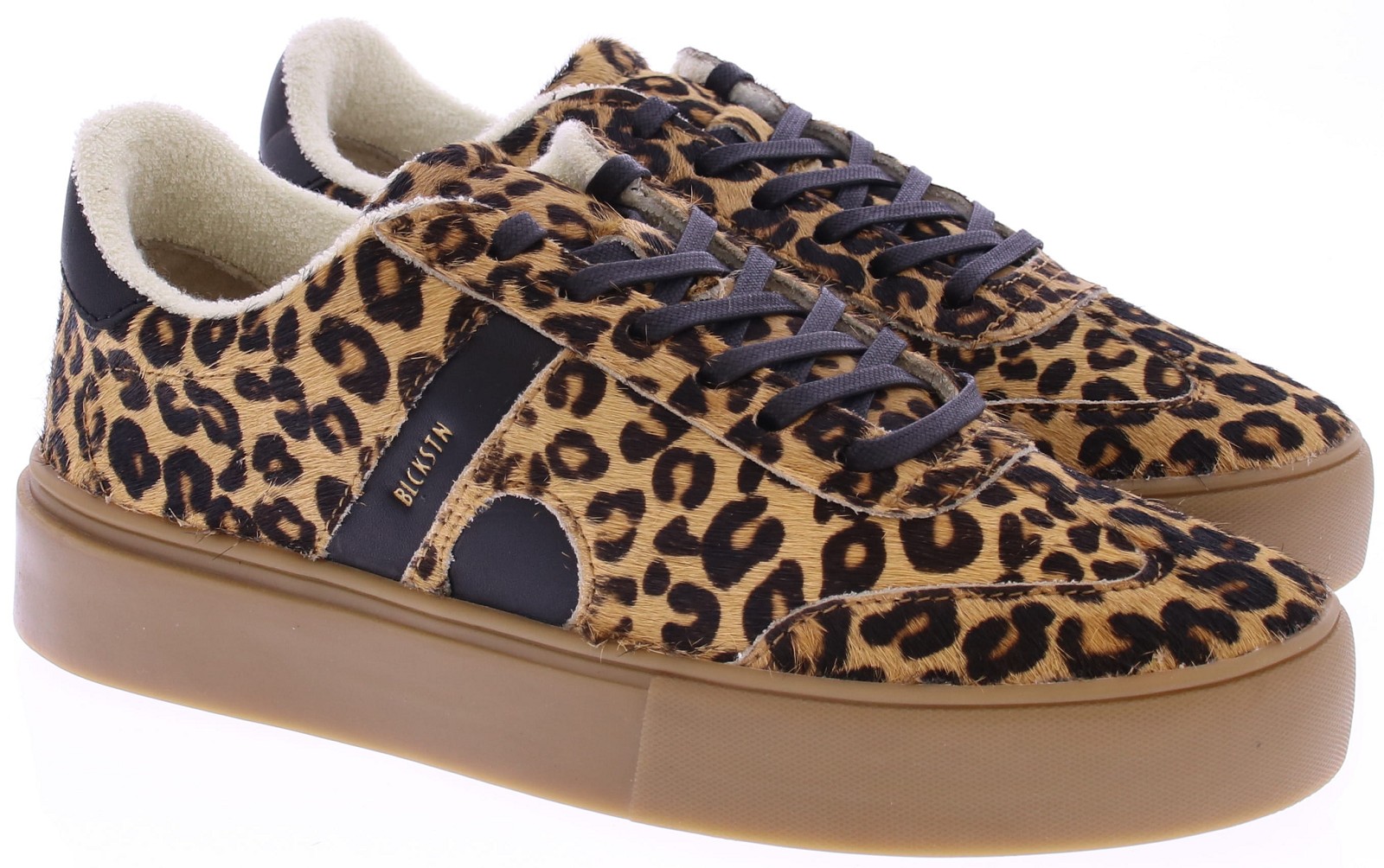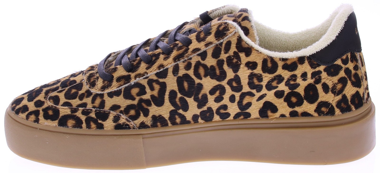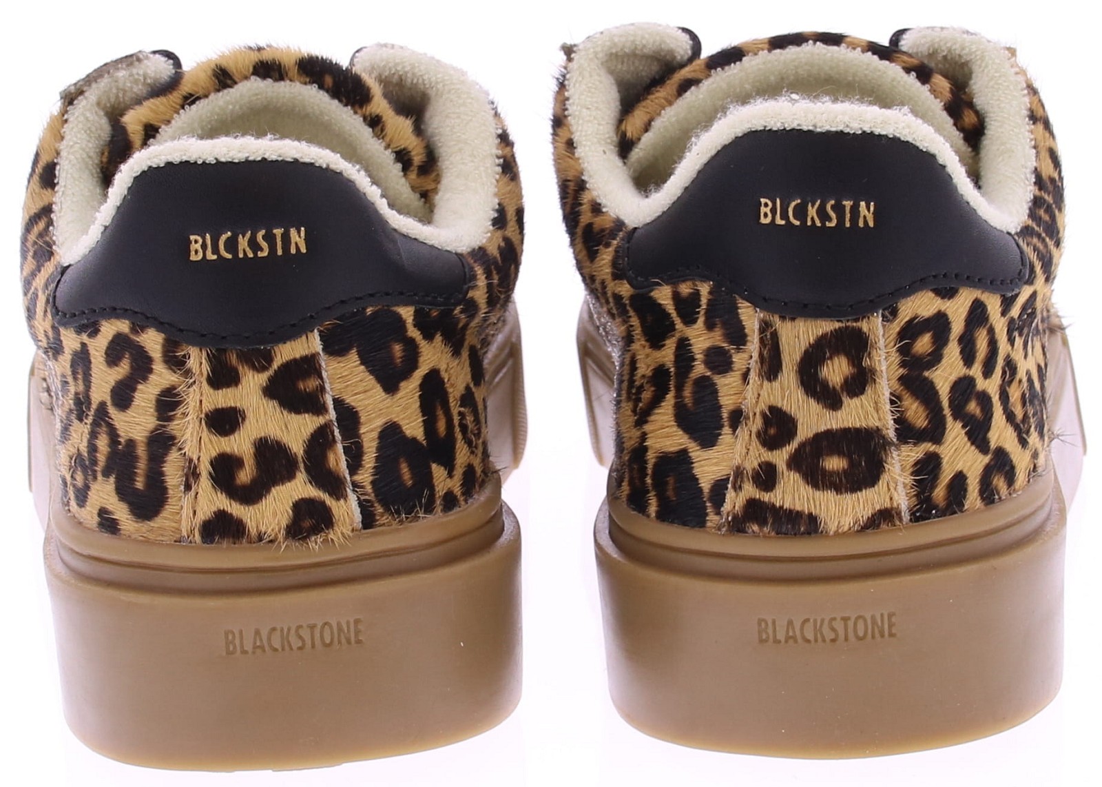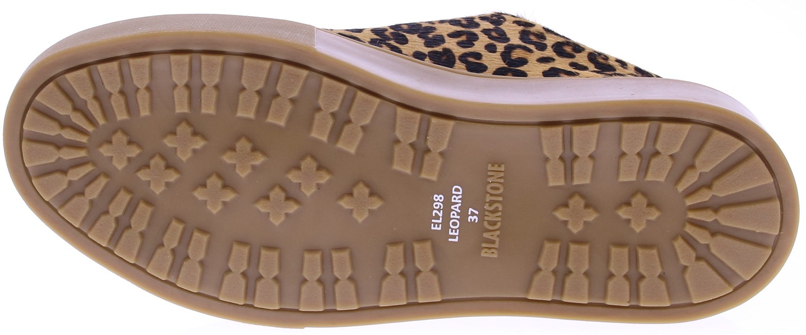 Panterprint dames sneaker van Blackstone EL298. Uitgevoerd in "pony"materiaal met zwart leren details en zwarte veter. Het zachte voetbed is uitneembaar. Aan de zijkant zit een goudkleurig logo.