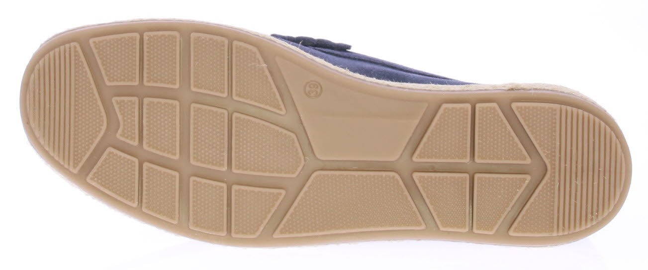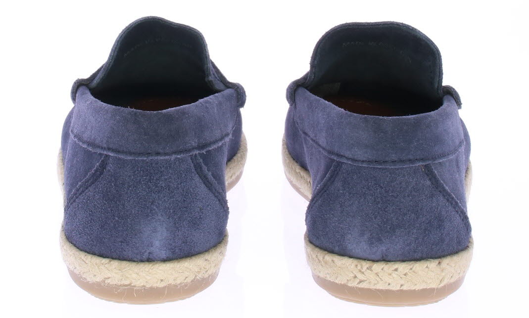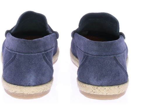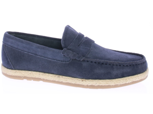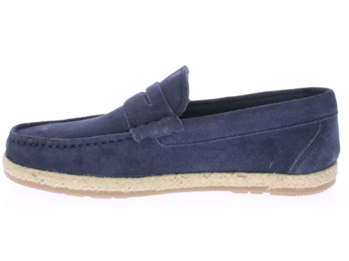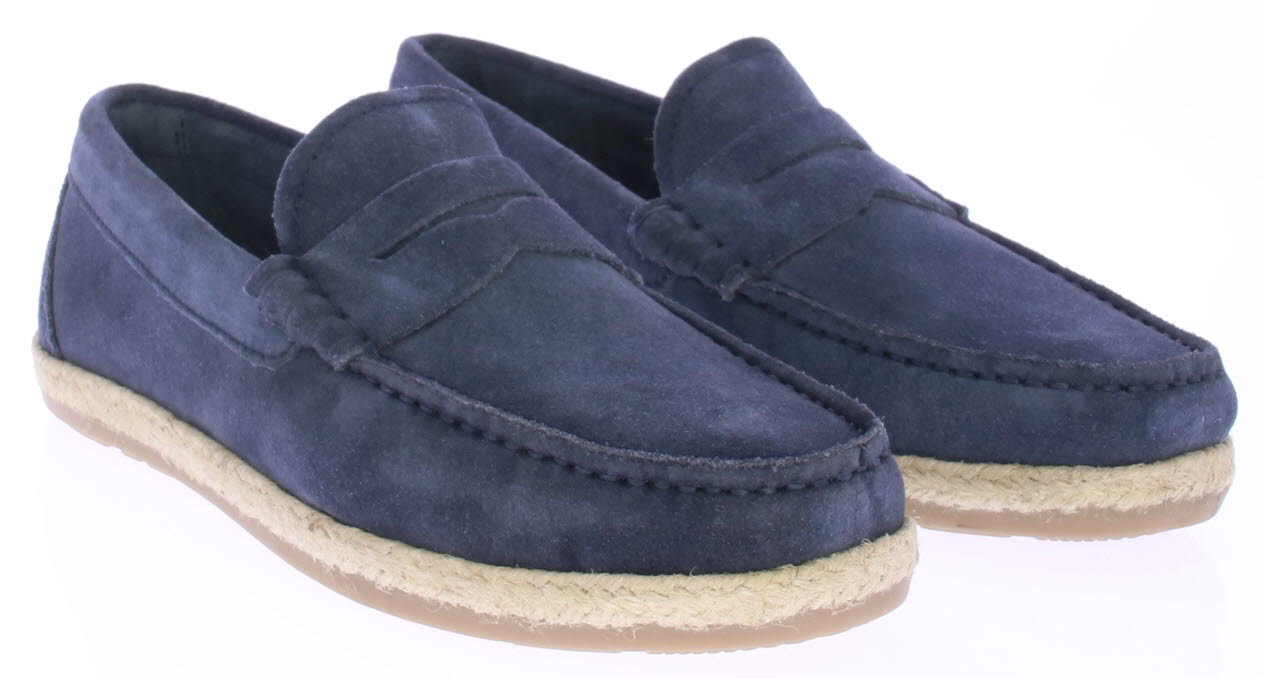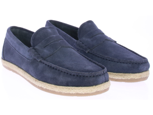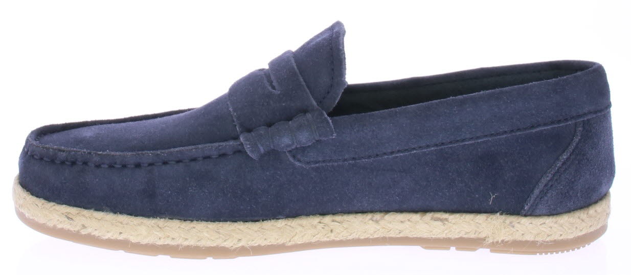 Donker blauwe suede heren instapper van Cypres. De instapper is ongevoerd en daarom licht en ademend draagbaar voor in de zomer. Langs de zool loopt een touwrand. De zool is van rubber.