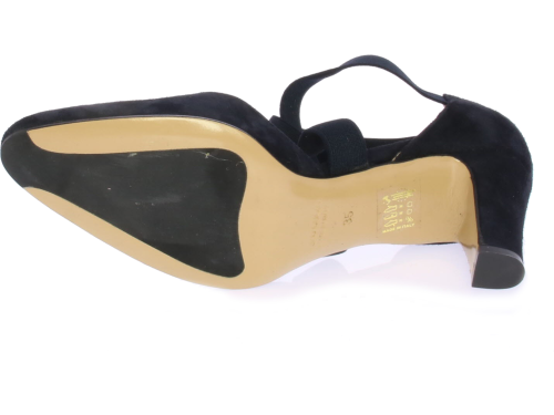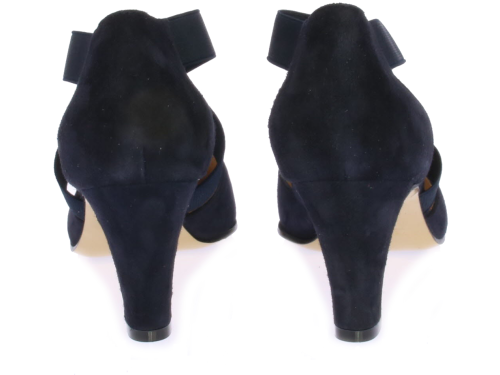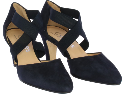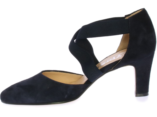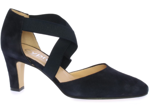 Donkerblauw suede dames pump van CYPRES. De pump is opengewerkt aan de zijkanten en heeft een elastieke kruisband over de wreef. De pump heeft een hak van 6 cm. De leren zool heeft een rubberen inzet.