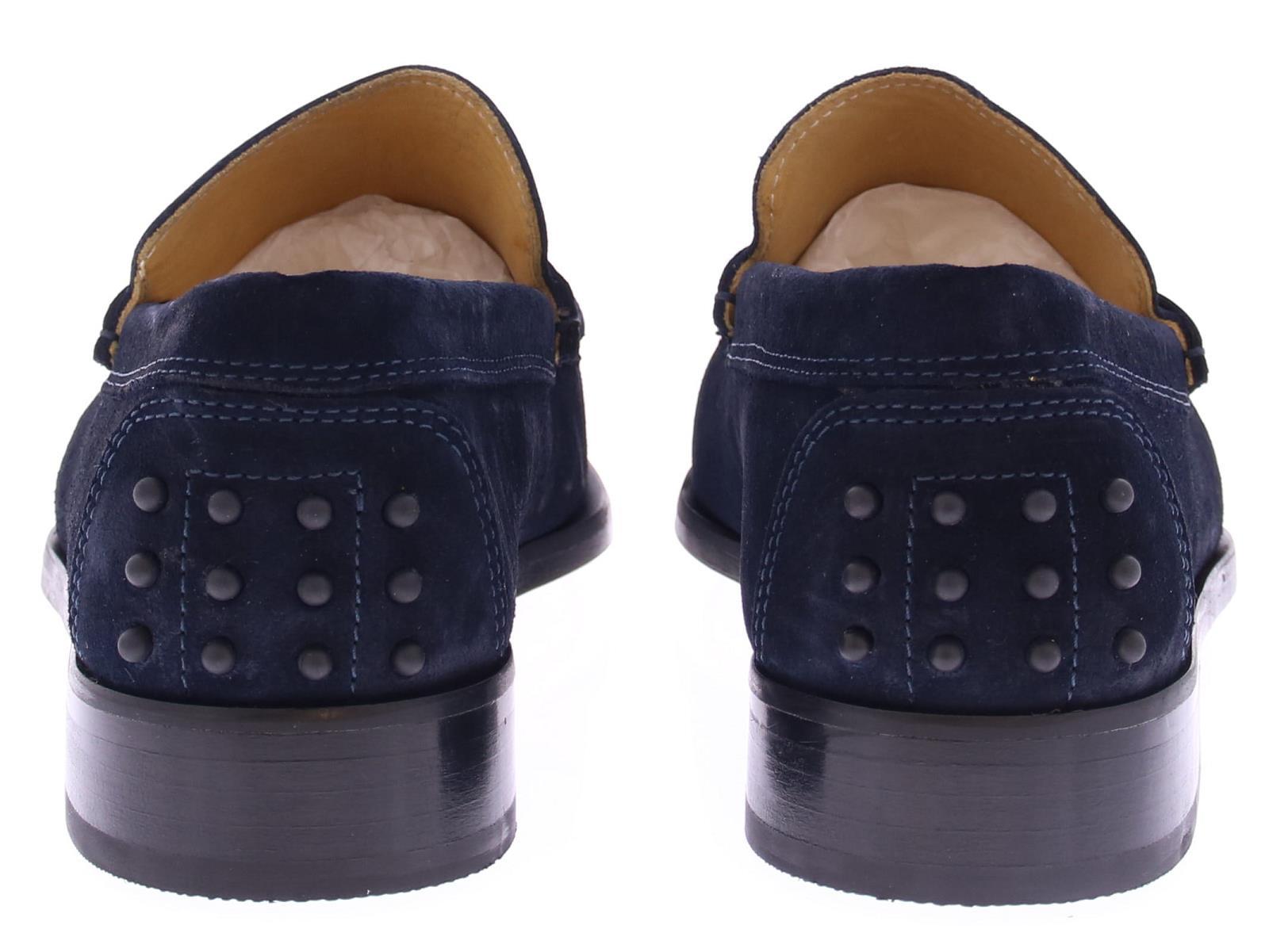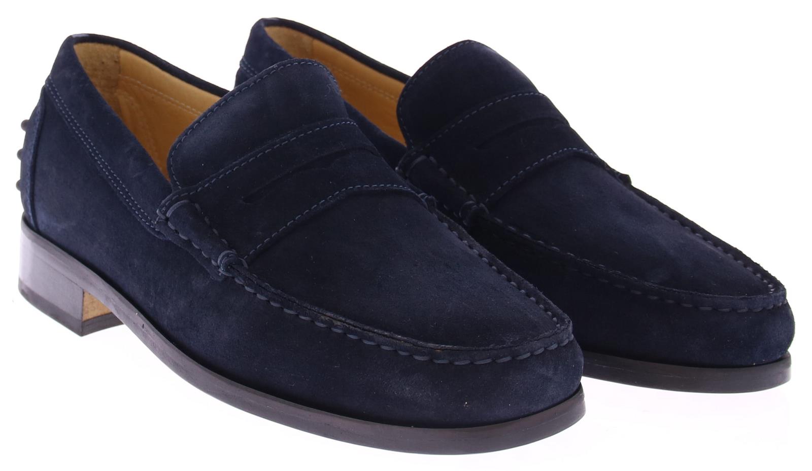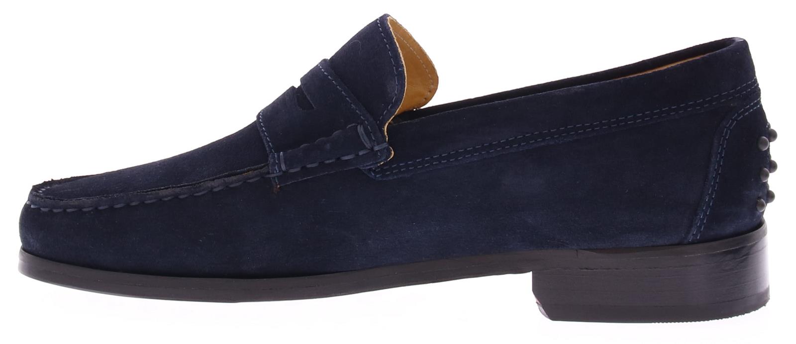 Donker blauwe suede heren instapper van Daniel Kenneth. Deze schoen heeft een leren zool met rubber opzet, en heeft rubberen dopjes op de hiel.
