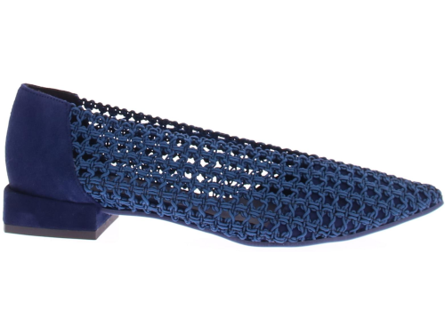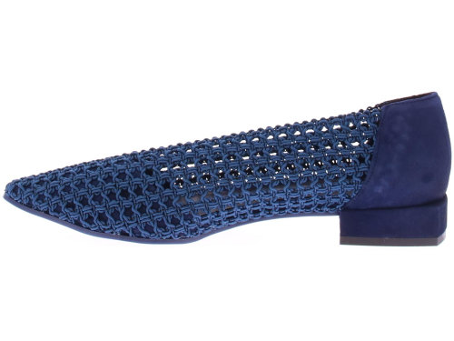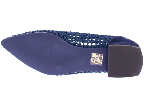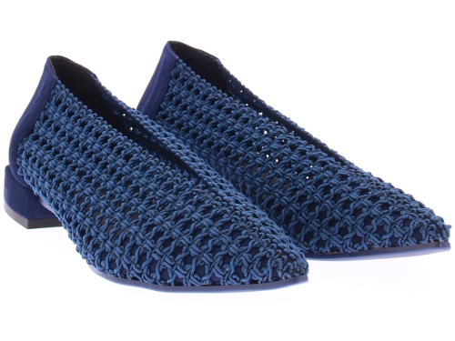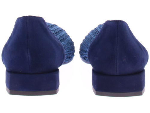 Donkerblauwe gehaakte stoffen dames instapper van Daniele Ancarani. Deze elastische gehaakte stoffen instapper heeft een versteviging van leer in de hiel en neus. Het elegante hakje heeft een hoogte van 2 cm en de zool is van rubber.