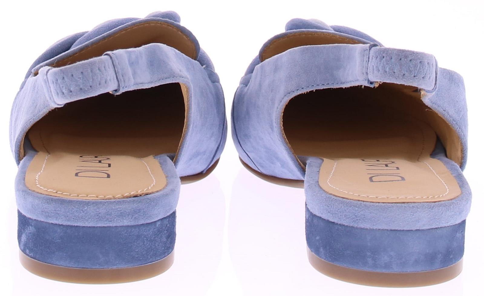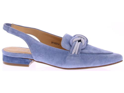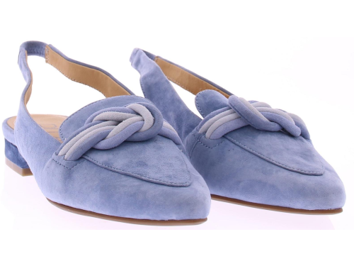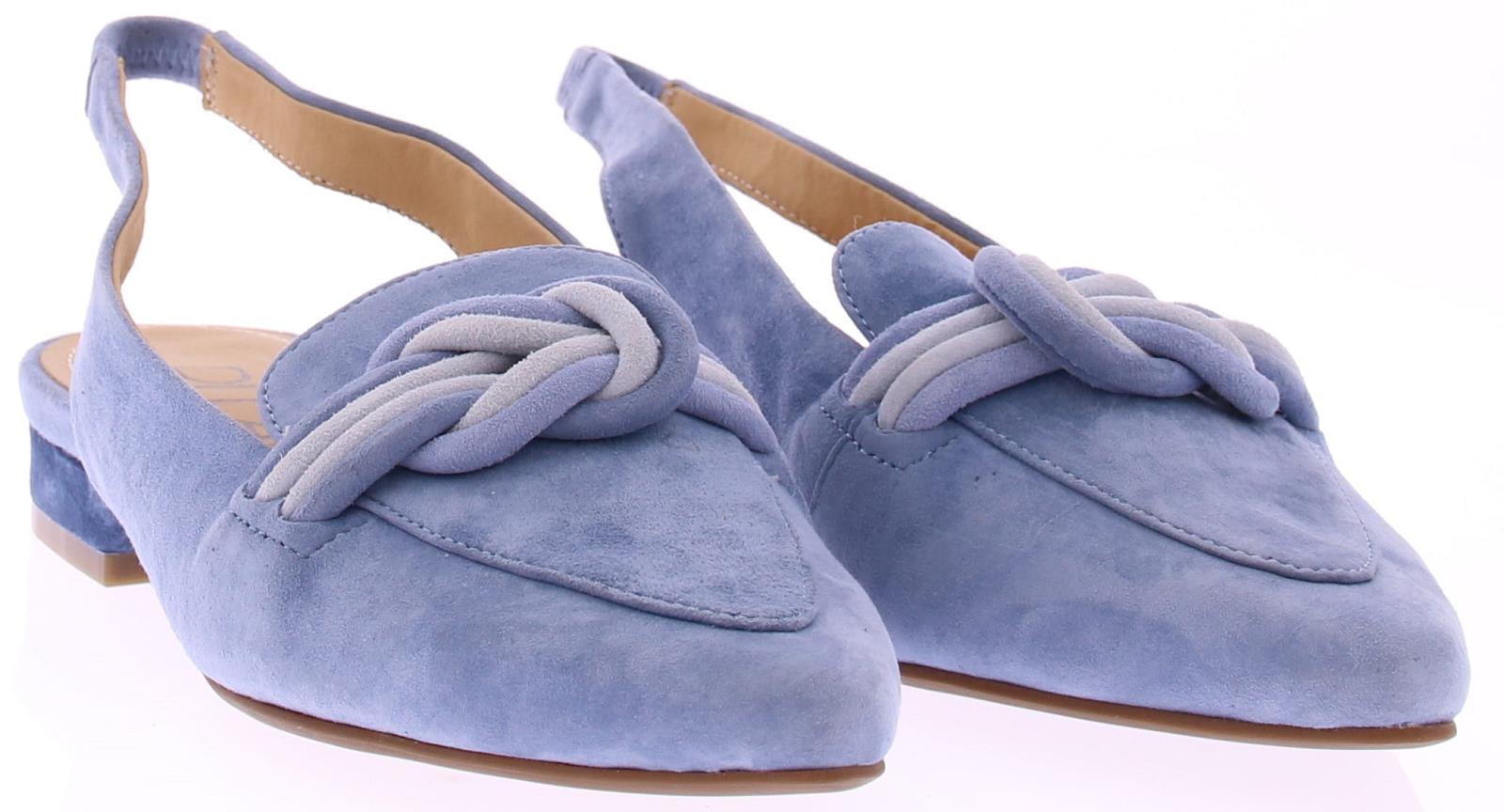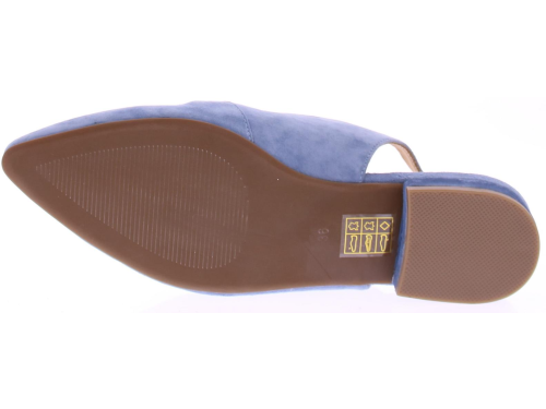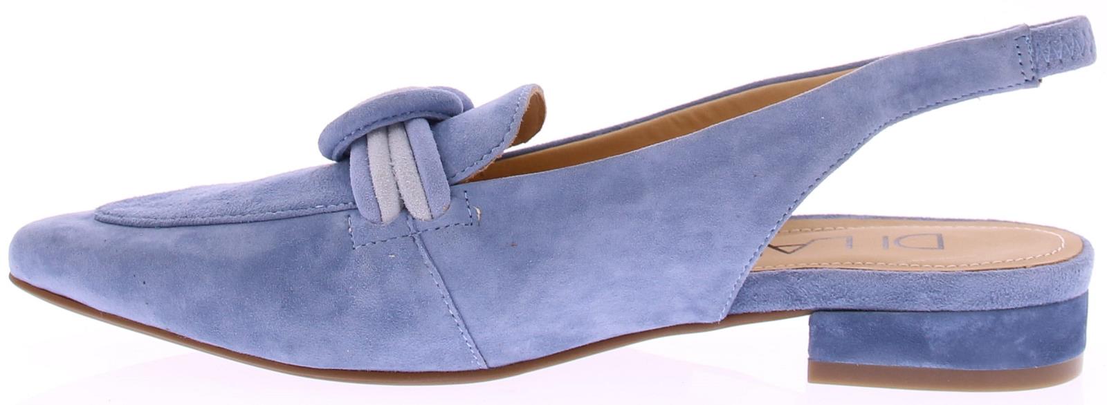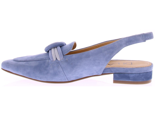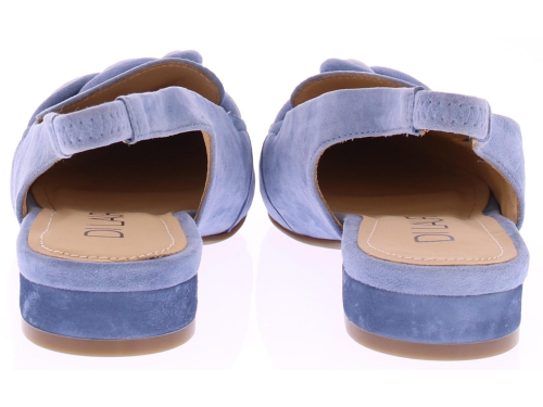 Licht blauw suede dames slingback van Di Lauro. Dit model heeft een iets spitsere neus en een gedraaide suede garnering in lichtblauw over de wreef. In de hielband zit elastiek zodat de schoen mooi aansluit. Het comfortabele hakje heeft een hoogte van 2 cm en de zool is van rubber.