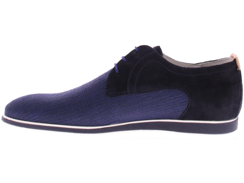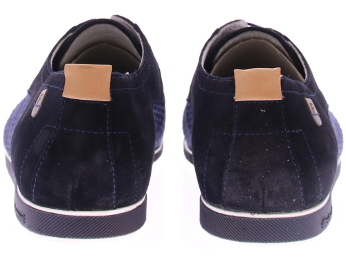 Heren veterschoen van Floris van Bommel met een sisal voorblad in blauw met een suede achterpand. De schoen heeft een blauw/wit rubber zool met leren voering. De schoen is gemaakt op de H leest. artikel code : Presli 02.35.