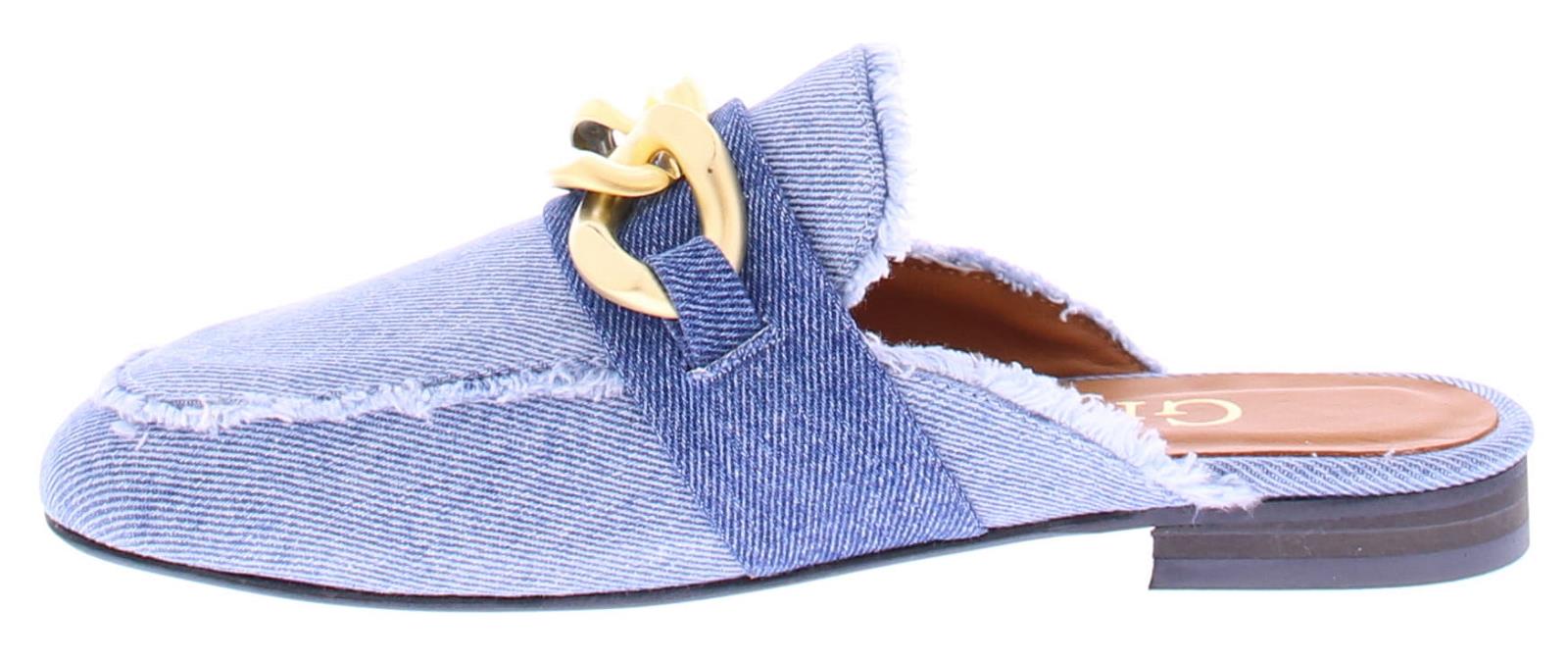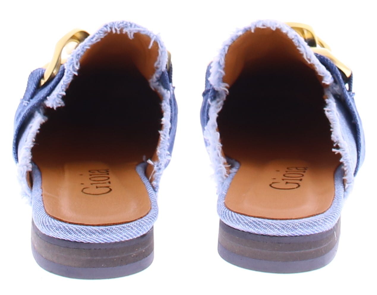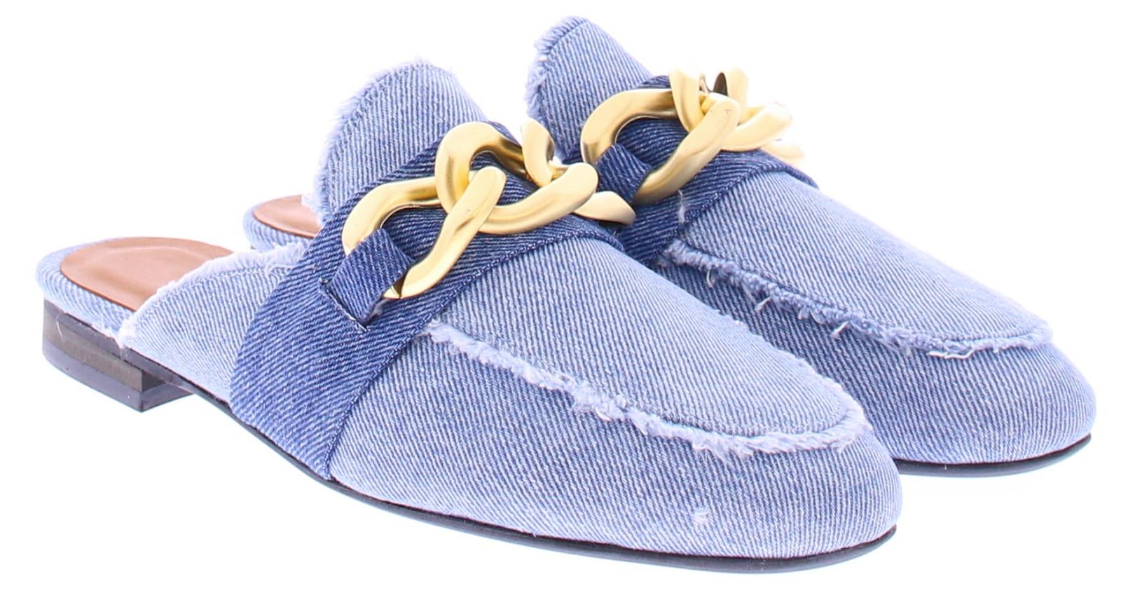 Jeans stoffen dames muil van Gioia. Dit model heeft een leuke goudkleurige bit over de wreef en en is afgewerkt met rafels. De voering en het voetbed zijn van leer. De trend van dit seizoen!