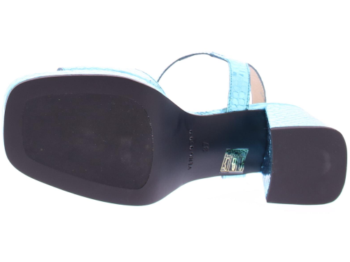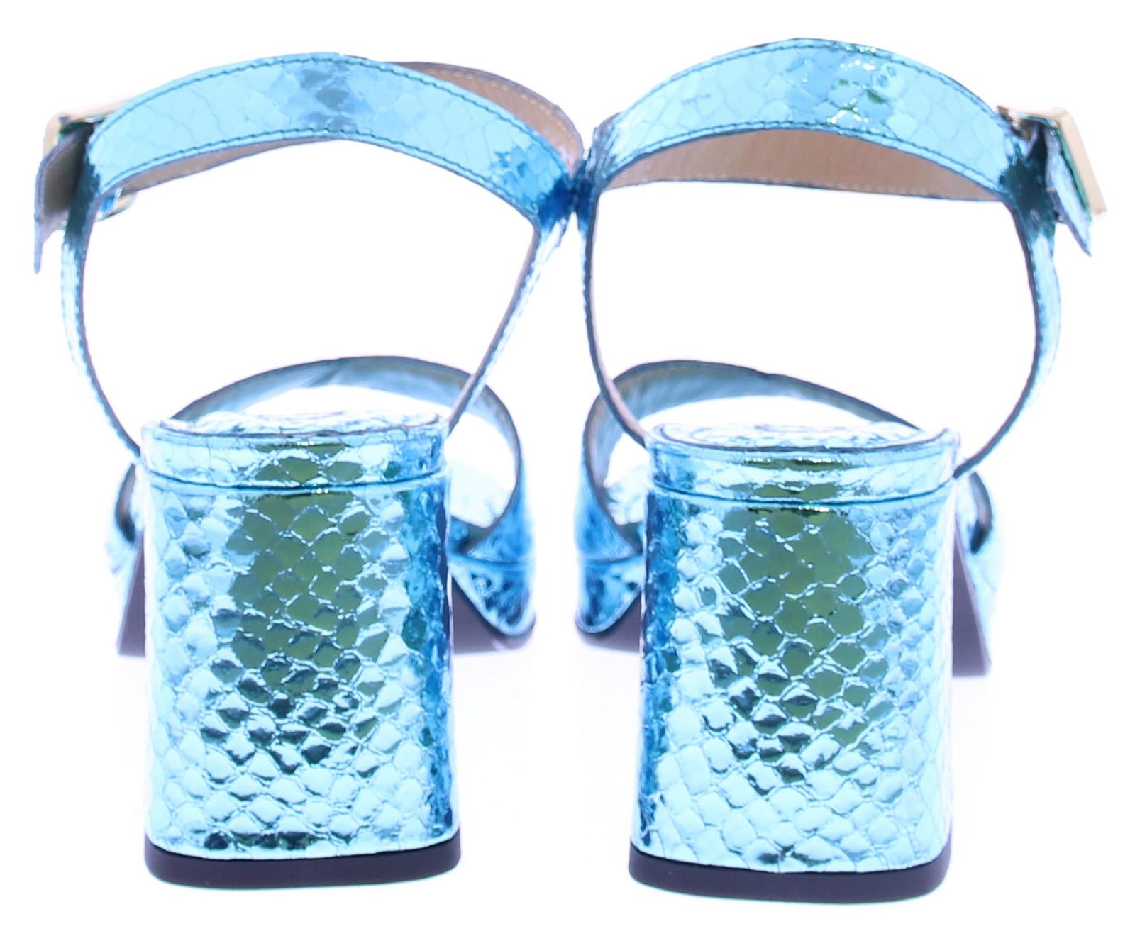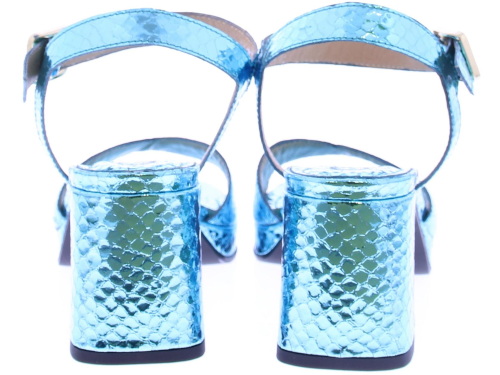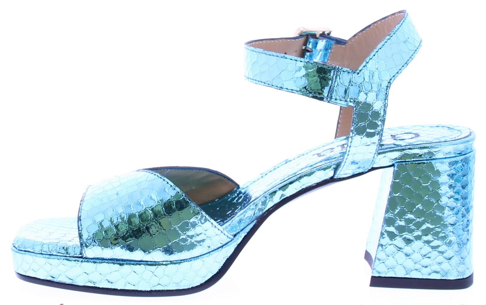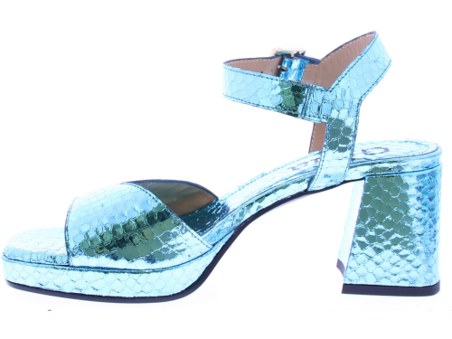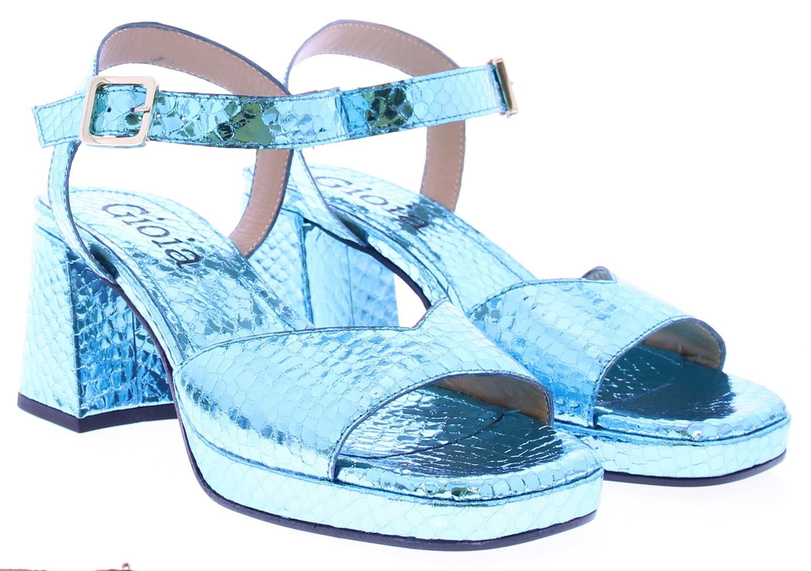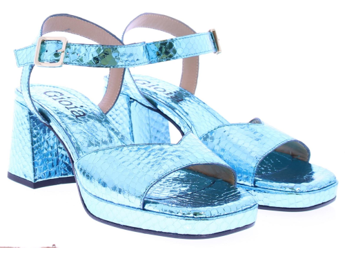 Blauw metallic leer met een slangeprint dames sandaal van Gioia. Deze sandaal heeft een brede band over de voet en een enkelband met een zilverkleurig gespje. De plateau zool heeft een hoogte van 2 cm en de hak is 5 cm hoog. Het voetbed is van leer.