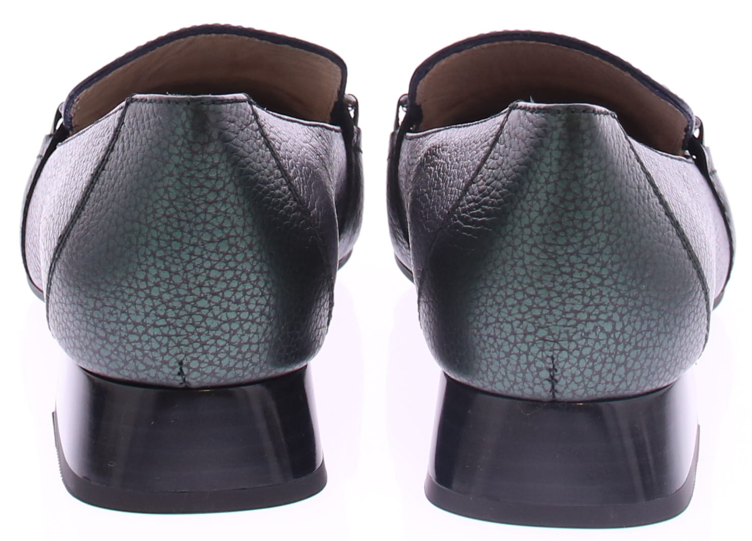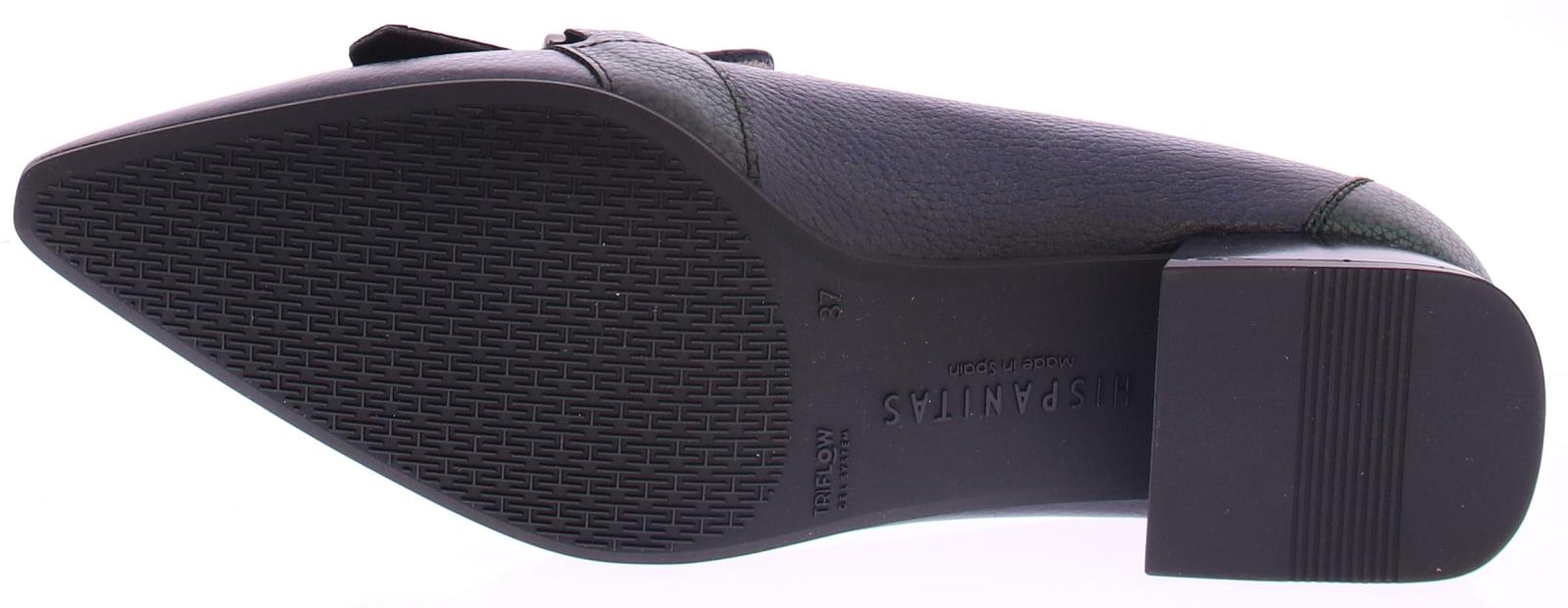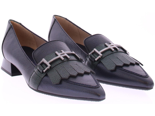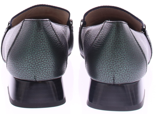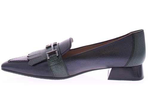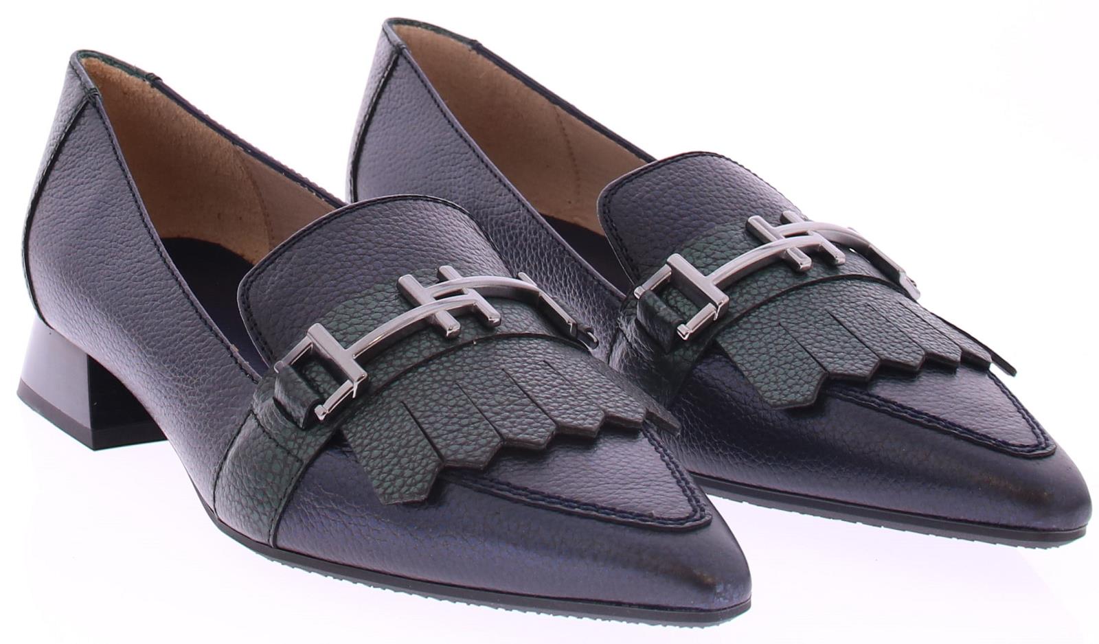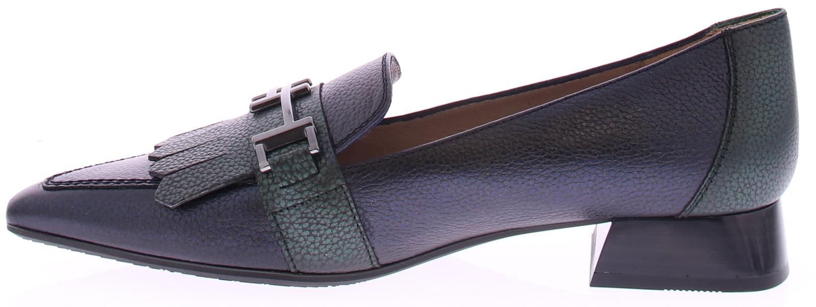 Donkerblauw met groen leren dames instapper van Hispanitas. Deze instapper heeft een groene jamboree klep over de wreef met een zilverkleurige bit. Het comfortabele hakje heeft een hoogte van 2 cm en de zool is van rubber.