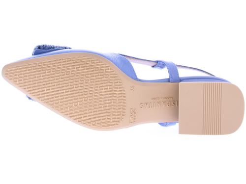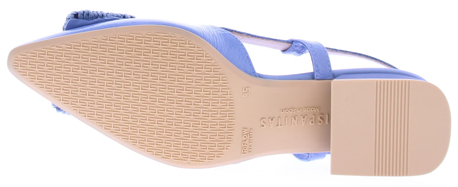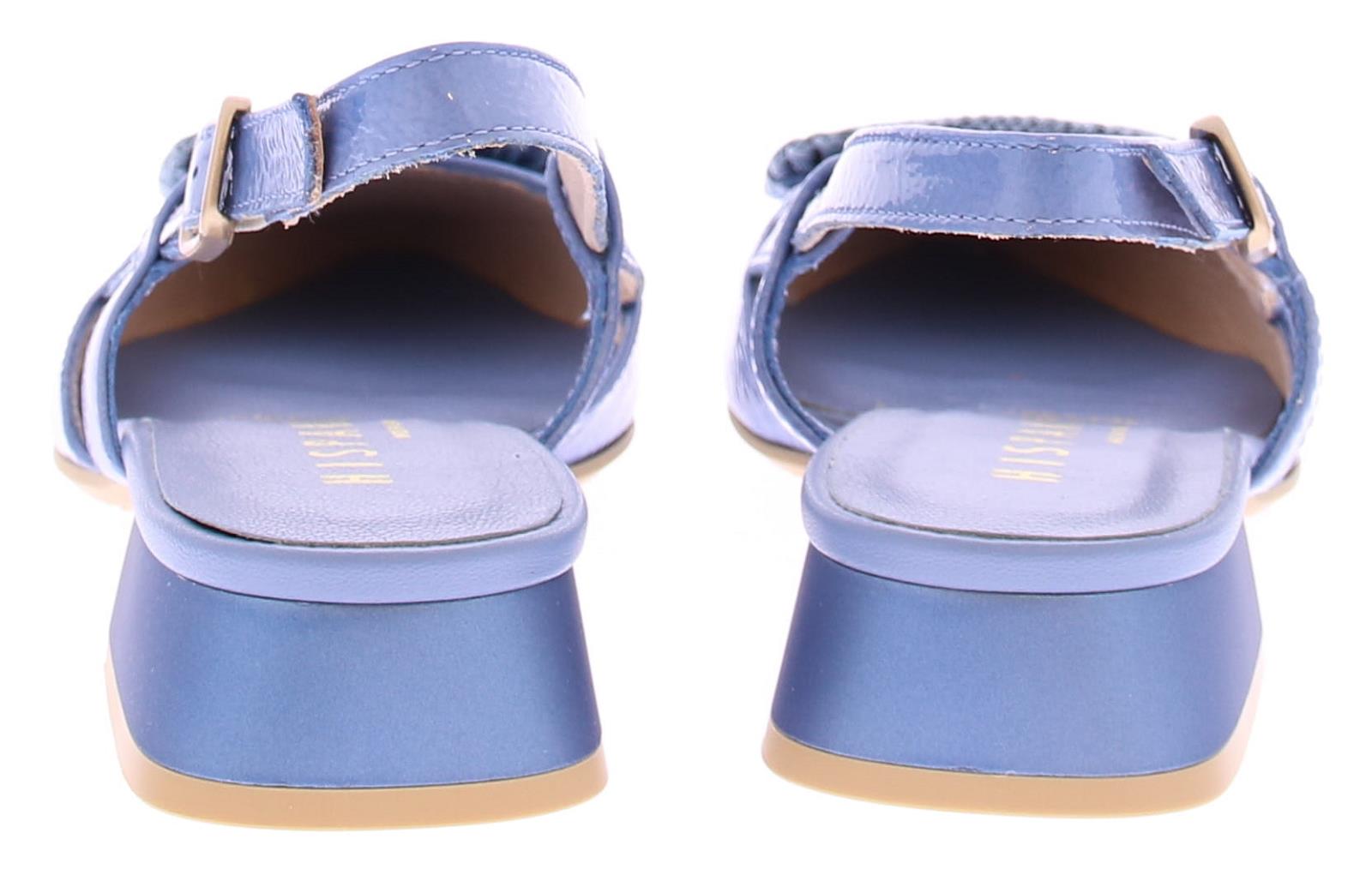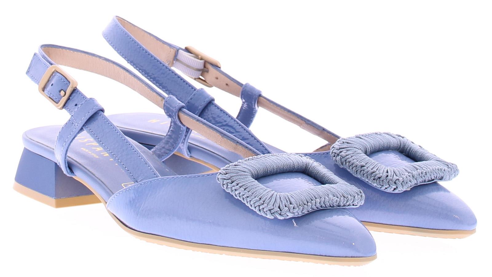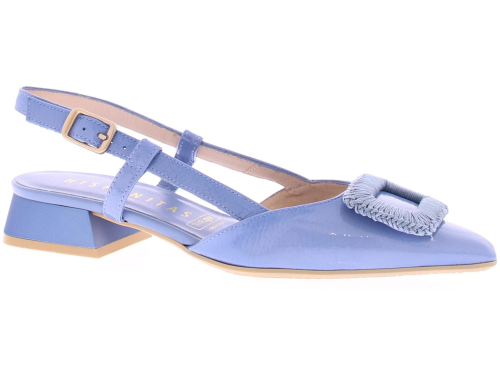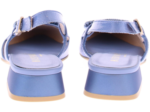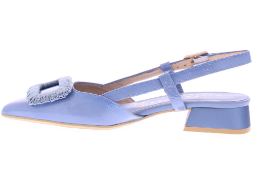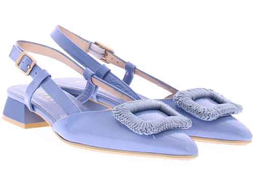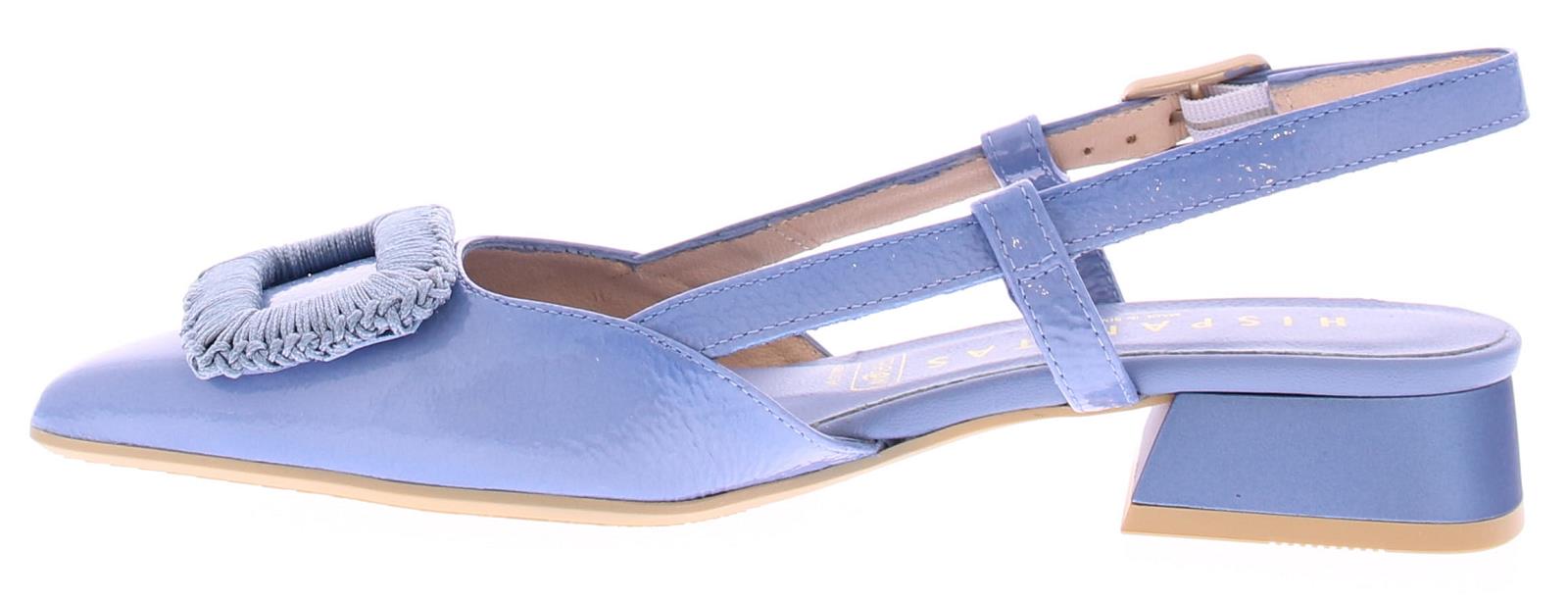 Jeans kleurige lak leren slingback pump van Hispanitas. De pump heeft een leuke gehaakte rechthoekige garnering over de voorvoet. Het hielbandje is verstelbaar met een gespje, en heeft een iets spitsere neus. De donkerblauwe hak heeft een hoogte van 2 cm.
