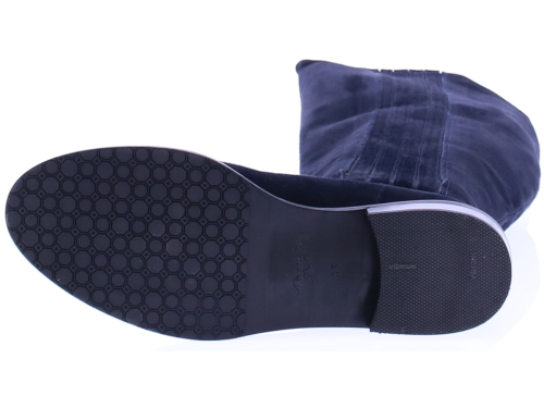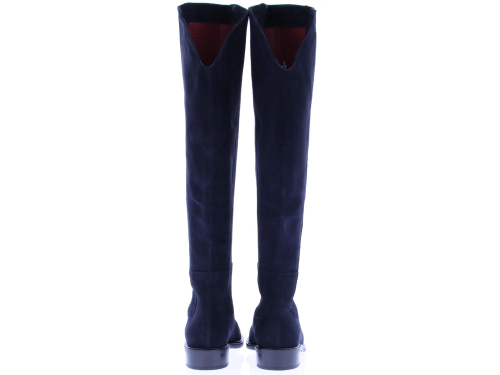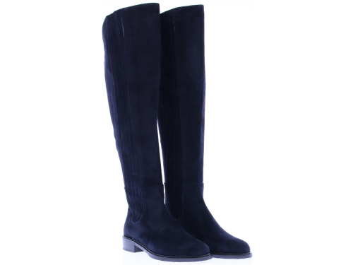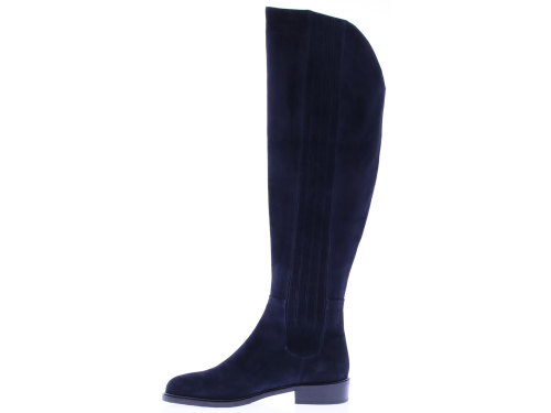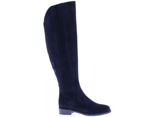 Donker blauw suede dames lange laars van Lilian. De laars heeft een lage hak en een met suede stroken bekleed elastiek aan beide zijde van de schacht voor extra kuitwijdte. Hij wordt ook wel verkocht als laars met XL schacht. De laars komt tot op de knie.