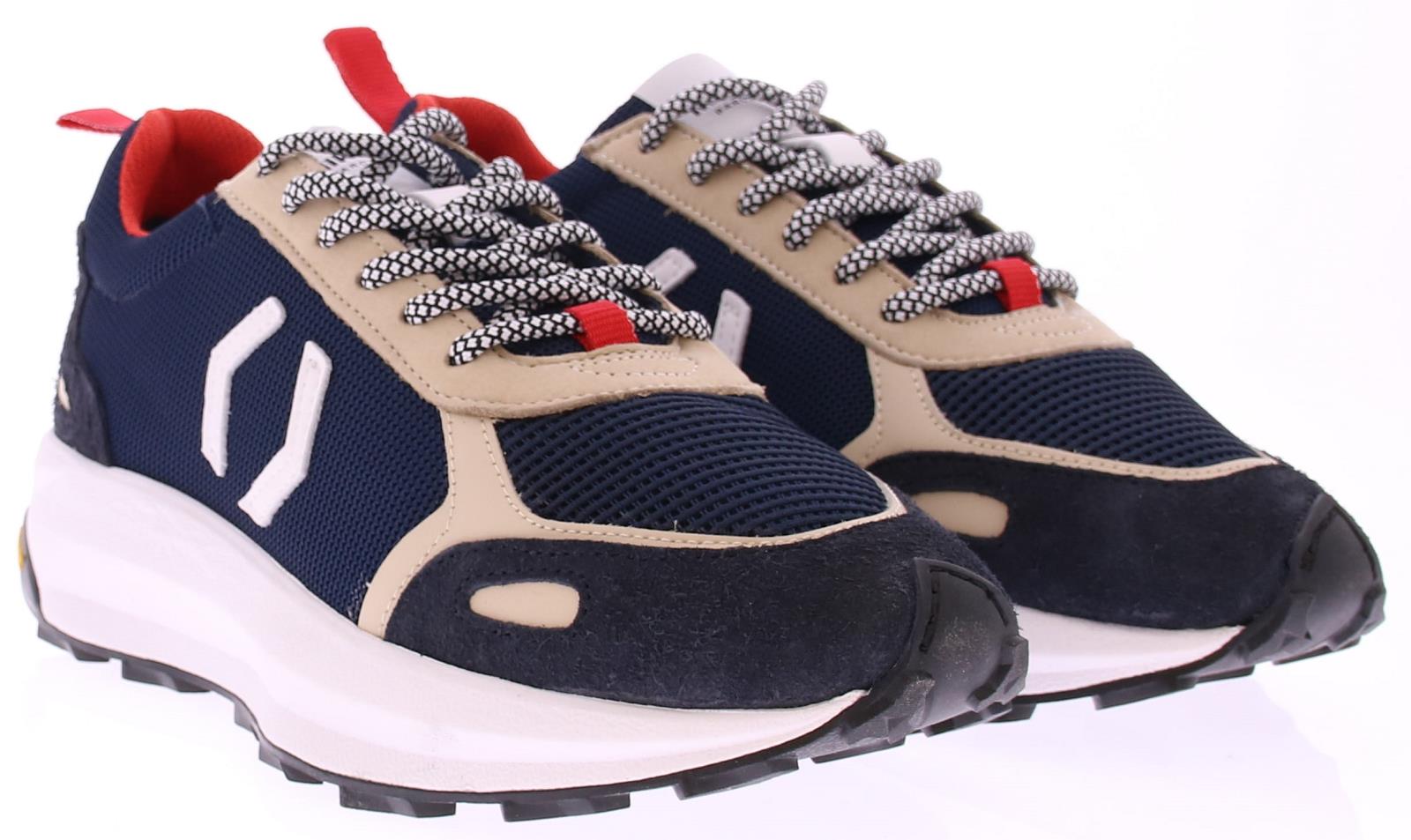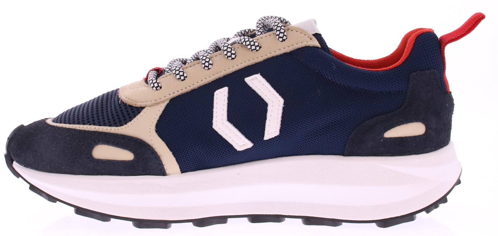 Donker blauwe/beige heren sneaker van Mikakus, het merk van voetballer Andres Iniesta. Deze sneaker is uitgevoerd in blauw met beige suede en heeft witte accenten. De schoen komt op een dikke witte rubberen vibram zool. De binnenzool is uitneembaar.