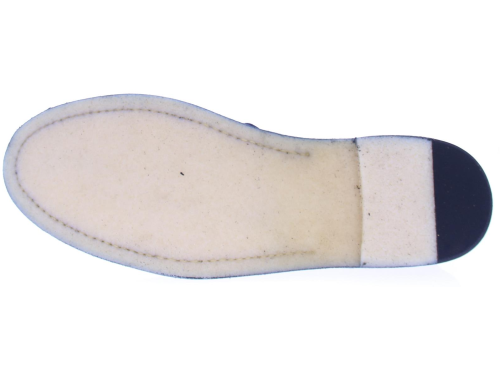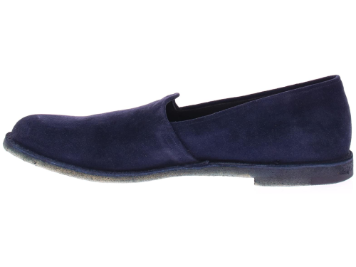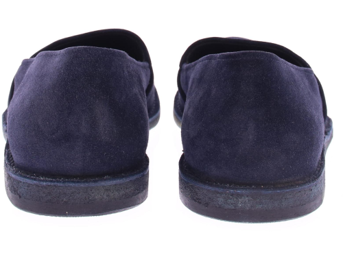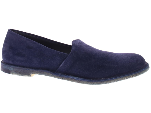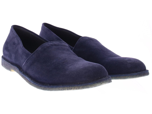 Heren instapper van Pantanetti op een crepe zool uitgevoerd en saint crispin gemaakt. Hierbij is het bovenwerk rondom horizontaal aan de binnenzool genaaid. Het bovenwerk is van donkerblauw suede met een leren voering.