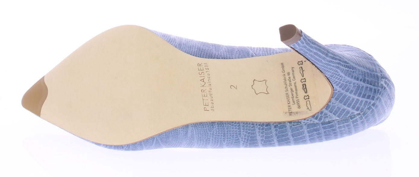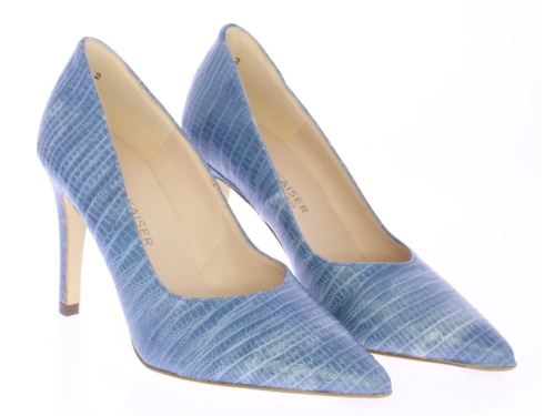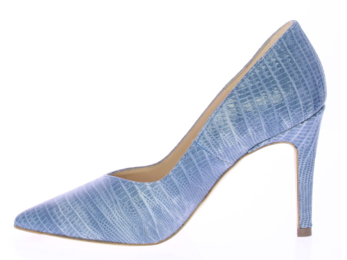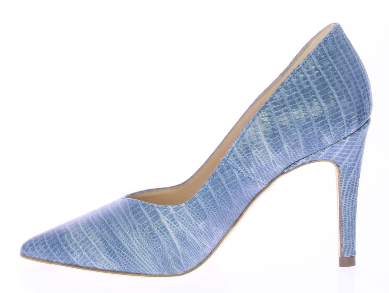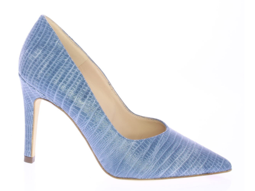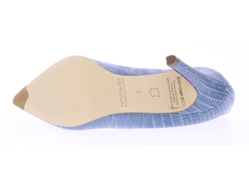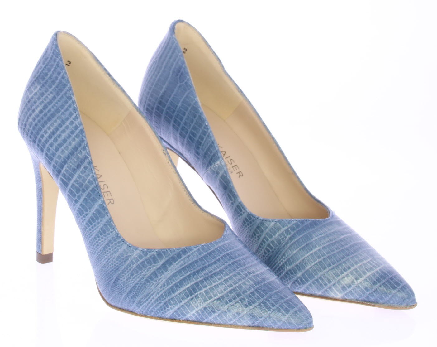 Jeanskleurige leren dames pump van Peter Kaiser. Op een mooie spitse leest met slanke hak van 8.5 cm. Het leer heeft een lizard print waar we ook een bijpassende cluch bij hebben.