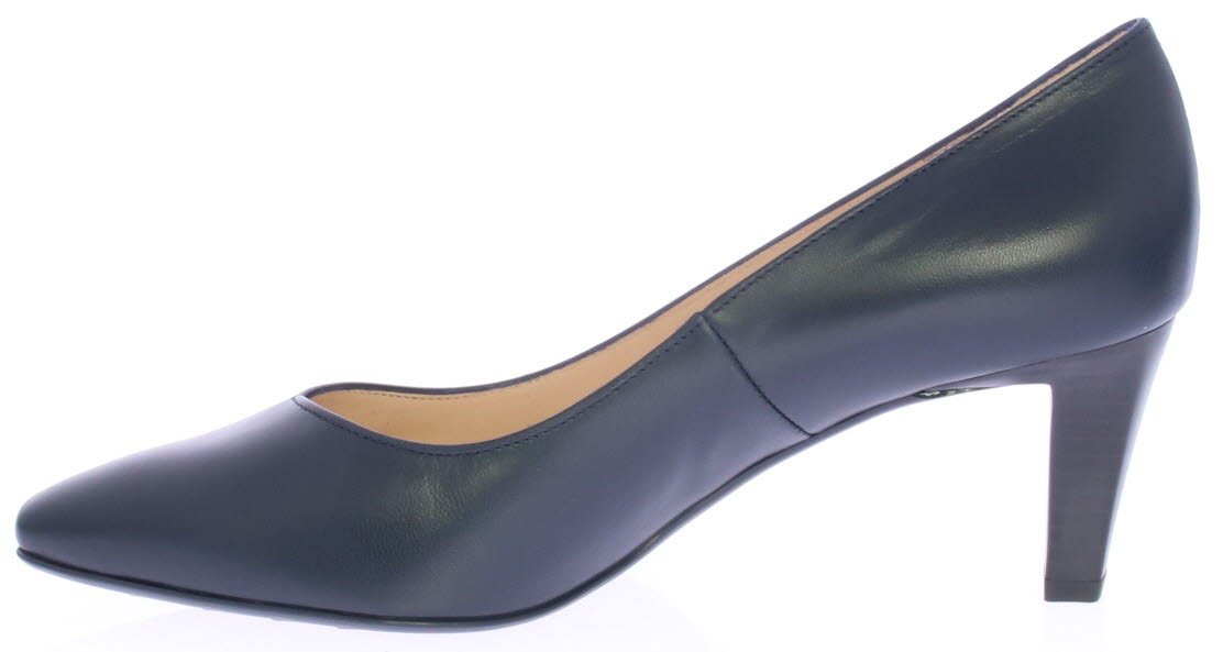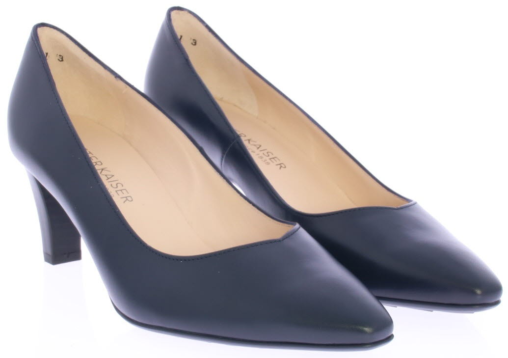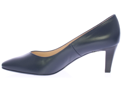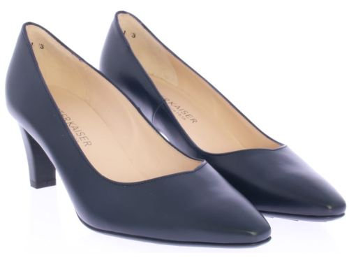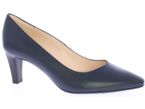 Donkerblauw leren dames pump van Peter Kaiser. De pump heeft een elegante V-uitsnijding op de voorvoet en heeft een mooie 6 cm hak. De pump heeft een tijdloos design waardoor hij makkelijk te combineren is. De kleur blauw is diep donker blauw.