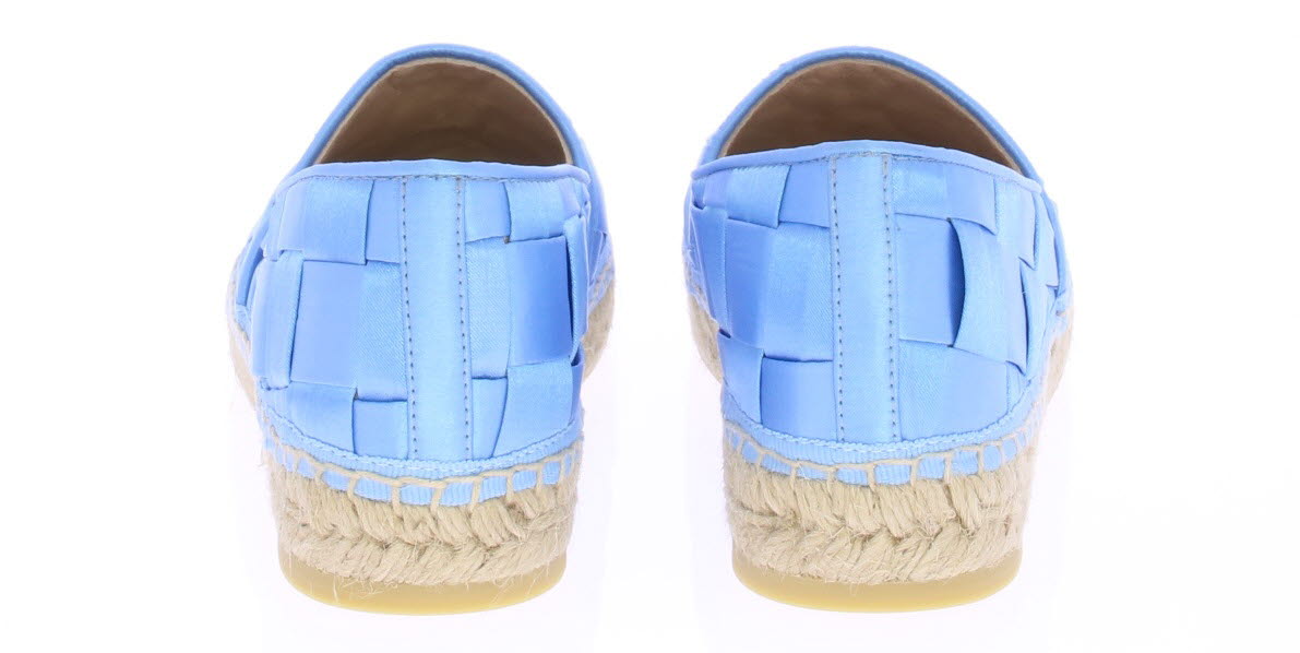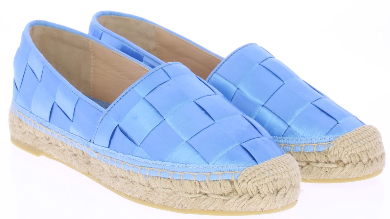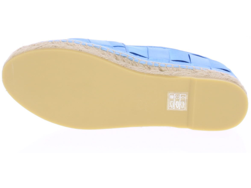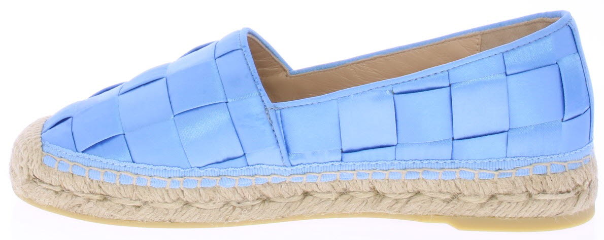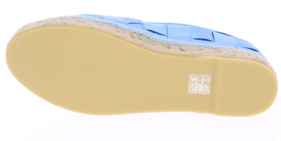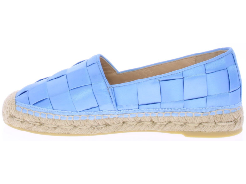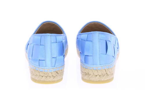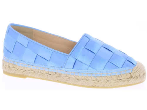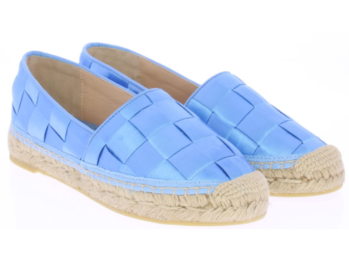 Hemelsblauwe dames espadrille van Ras. De espadrille is uitgevoerd in groot gevlochten satijn met touwzool en zachte leren voering. In dit materiaal en kleur hebben we ook een tasje van Ras. Let op: ze vallen klein.