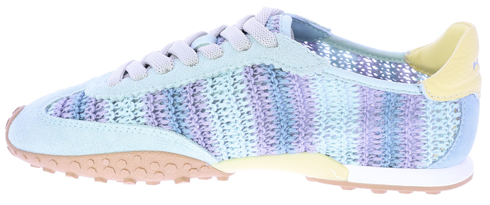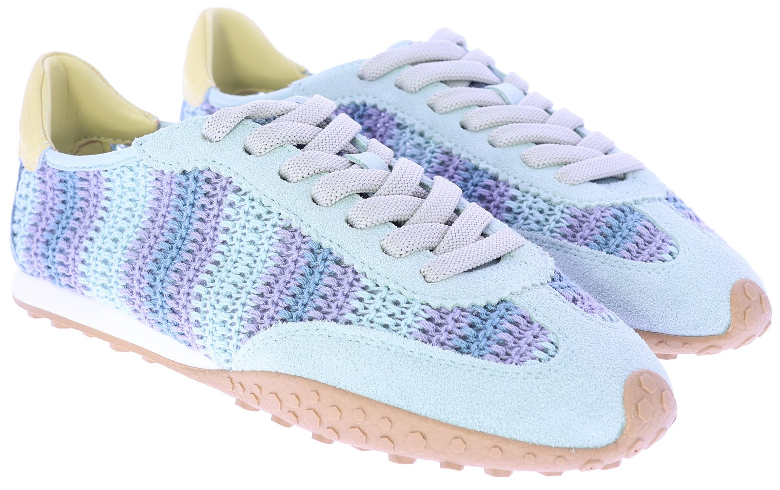 Lichtblauwe suède dames sneakers van Hoff, model bridge woven. Deze zomerse sneaker is uitgevoerd in gehaakt textiel met suède accenten, waardoor hij licht, luchtig en stijlvol is. De kleurenmix van blauw, lila en zachtgeel geeft een frisse en unieke uitstraling. De comfortabele zool zorgt voor een zachte afwikkeling bij iedere stap. Ontdek ook de andere dames sneakers van Hoff bij Klijsen.
