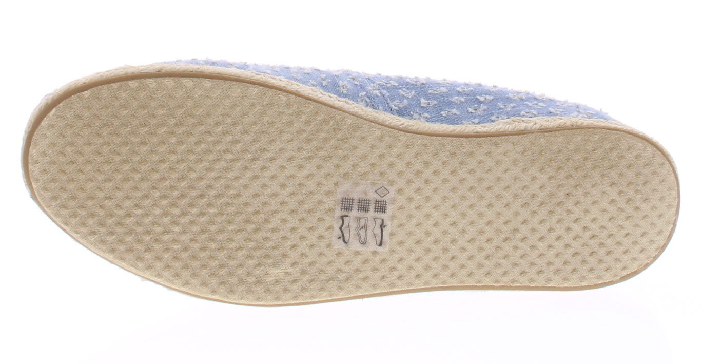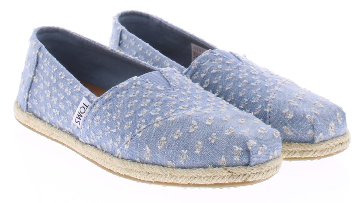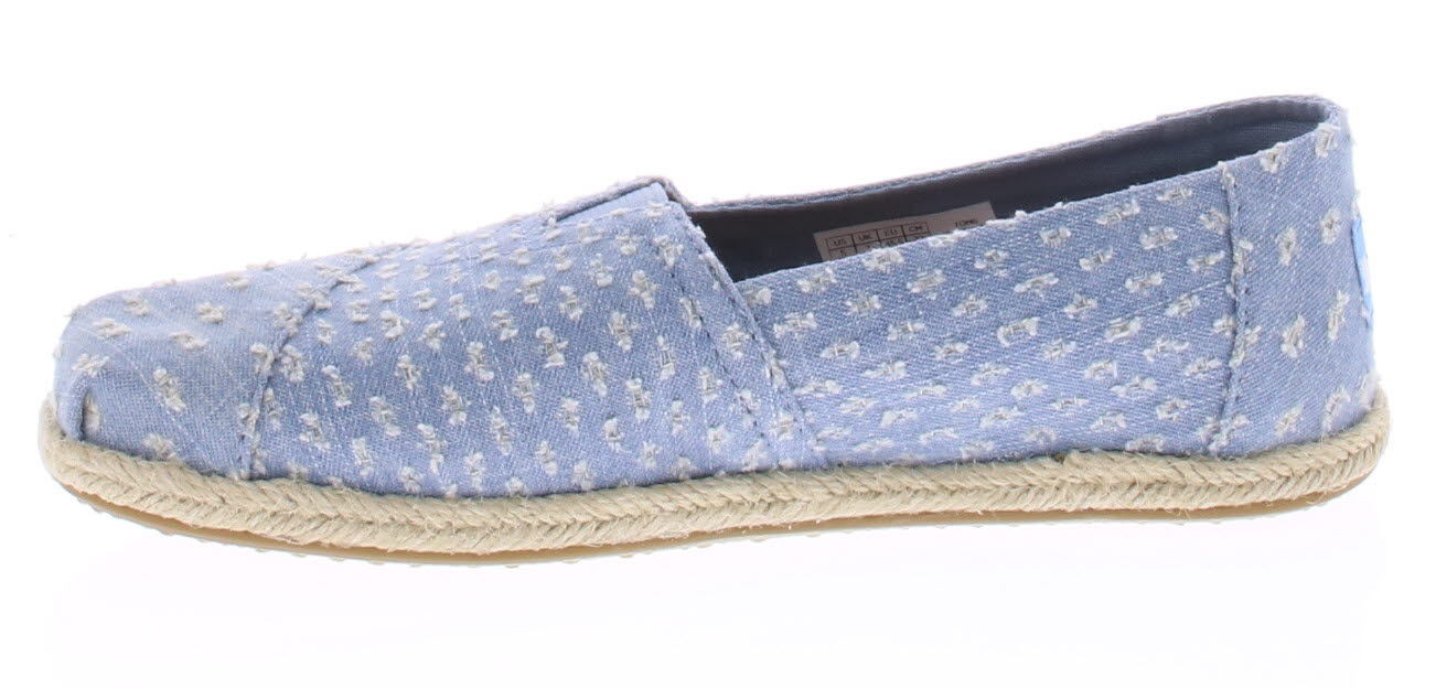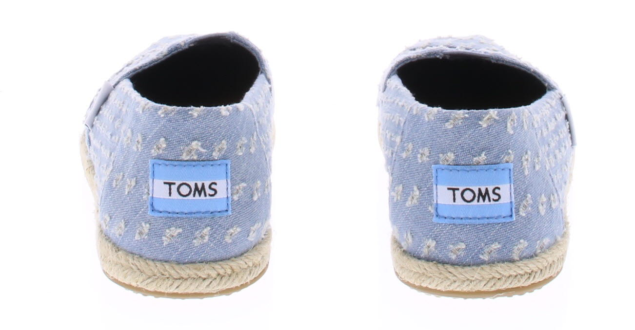 Blauw stoffen dames espadrille van TOMS. De instapper is uitgevoerd in een jeansstof met opengewerkte bewerking. De instapper heeft een touwzool en een heel comfortabel voetbed. Deze schoenen zijn helemaal vegan. Toms geeft voor elk verkocht paar Toms een kind in nood ook een paar. One for One.