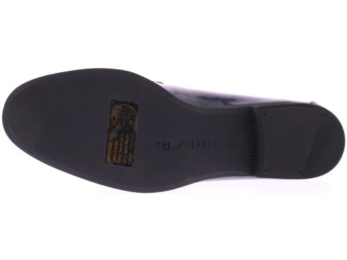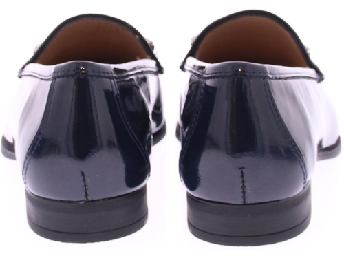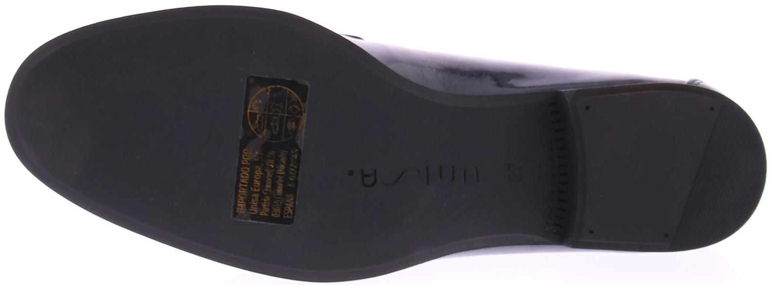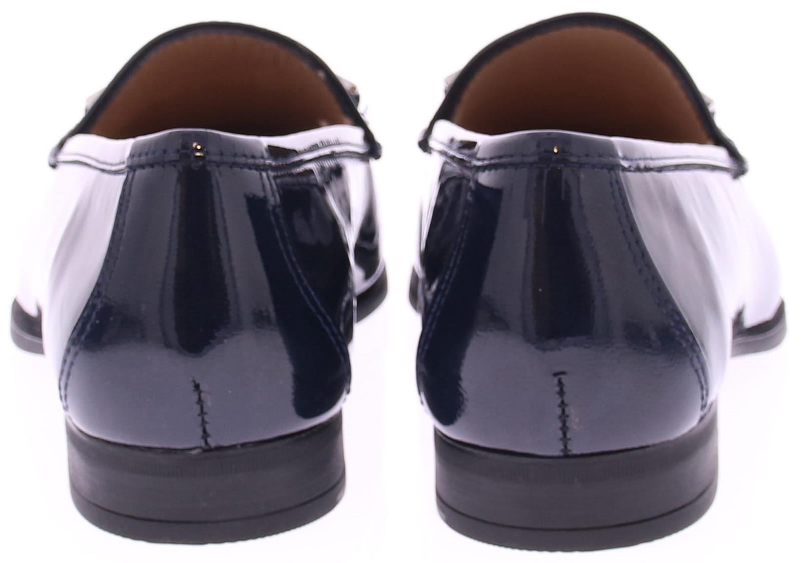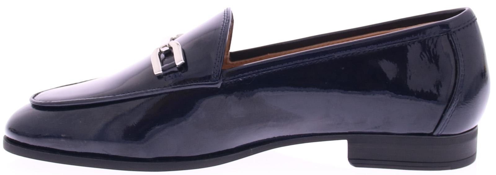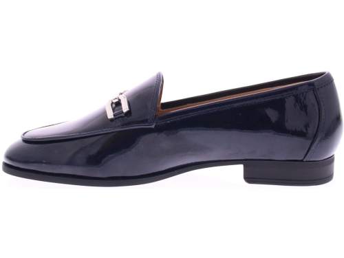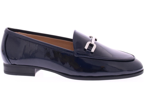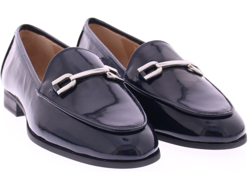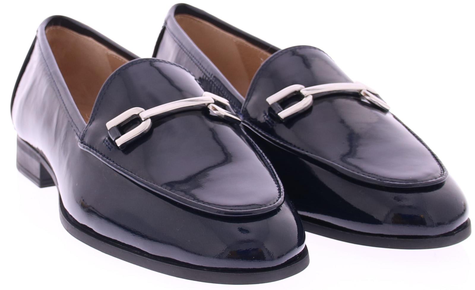 Donkerblauw lak leren dames instapper van Unisa. Mooie basic loafer met gouden bit op de wreef. De zachte leren voering en de rubberen zool maken hem extra comfortabel.