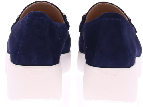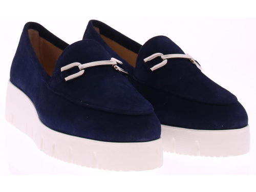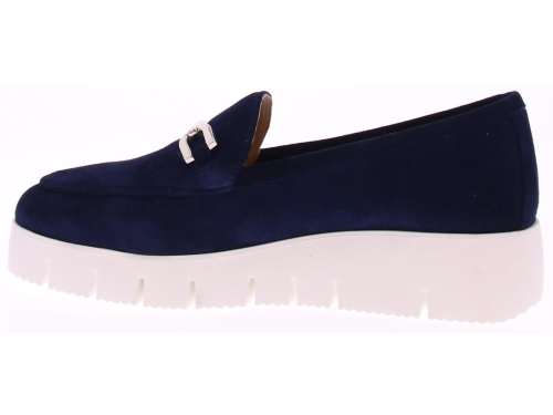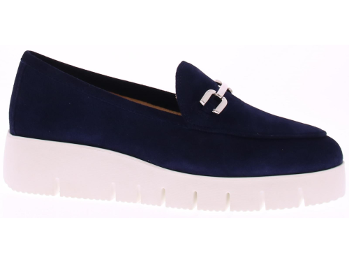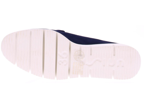 Donkerblauw suede dames instapper van Unisa. Kenmerkend aan de instapper is de sportieve, soepele witte zool en een sierlijk gouden bit op de voet. Het voorgevormde voetbed is van leer en de rubber zool heeft een licht profiel. Er is bij deze instapper een leuke bijpassende tas.