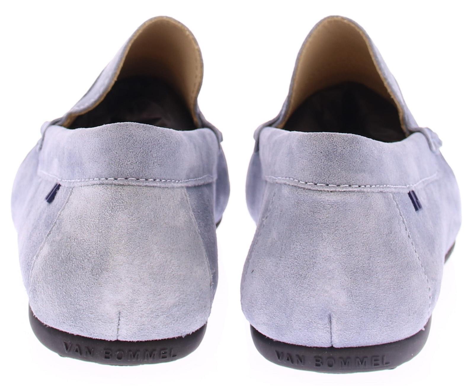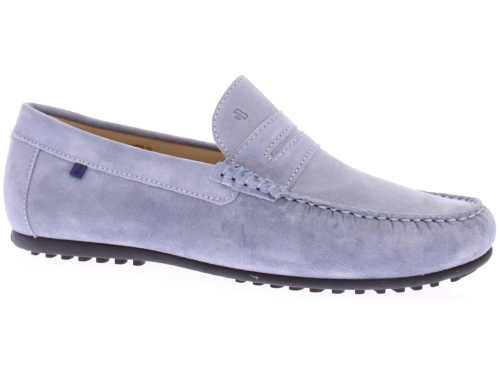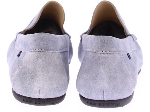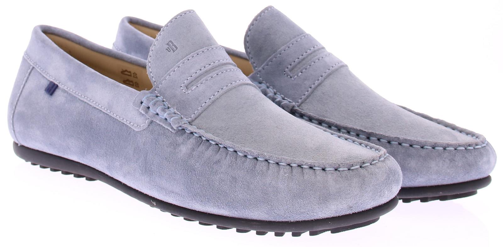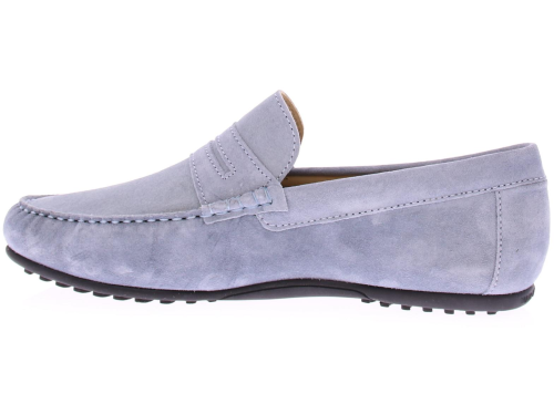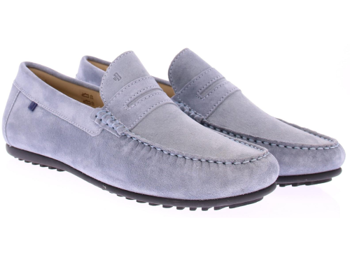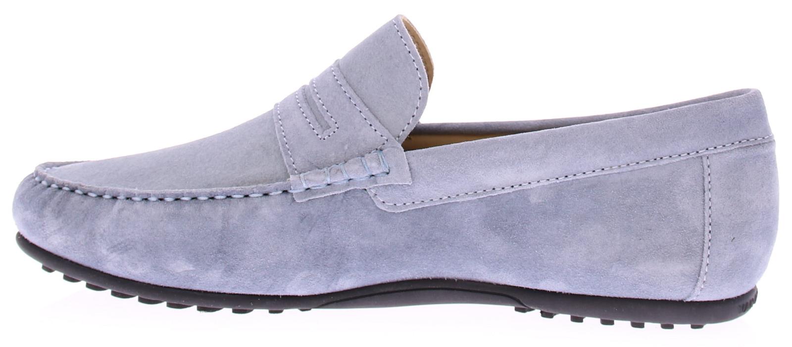 Heren Van Bommel loafer op een zwart rubber zool met een licht blauw suede bovenwerk. De schoen is leer gevoerd en gemaakt op de H leest.