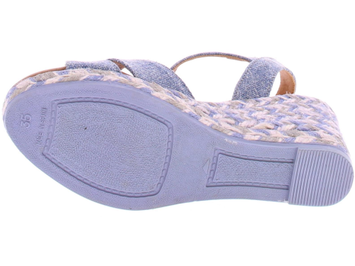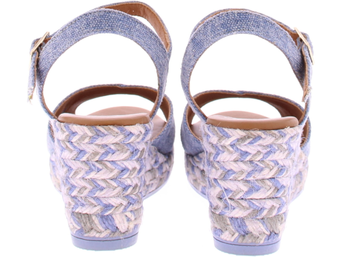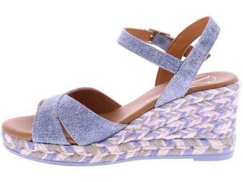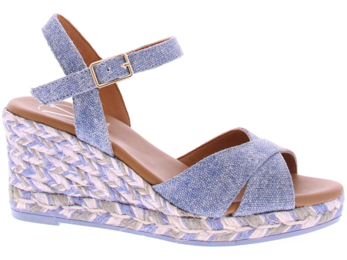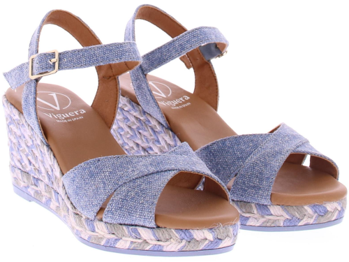 Jeans canvasstof met subtiel glittertje dames espadrille van het Spaanse merk Viguera. Deze sleehak heeft een leuke kruisband over de wreef. Het enkelbandje is verstelbaar met een goudkleurig gespje. De sleehak heeft een hoogte van 5 cm met een plateau van 1 cm. In de sleehak zit een meerkleurig stiksel verwerkt voor een leuk effect. De zachte luxe voering is van leer.