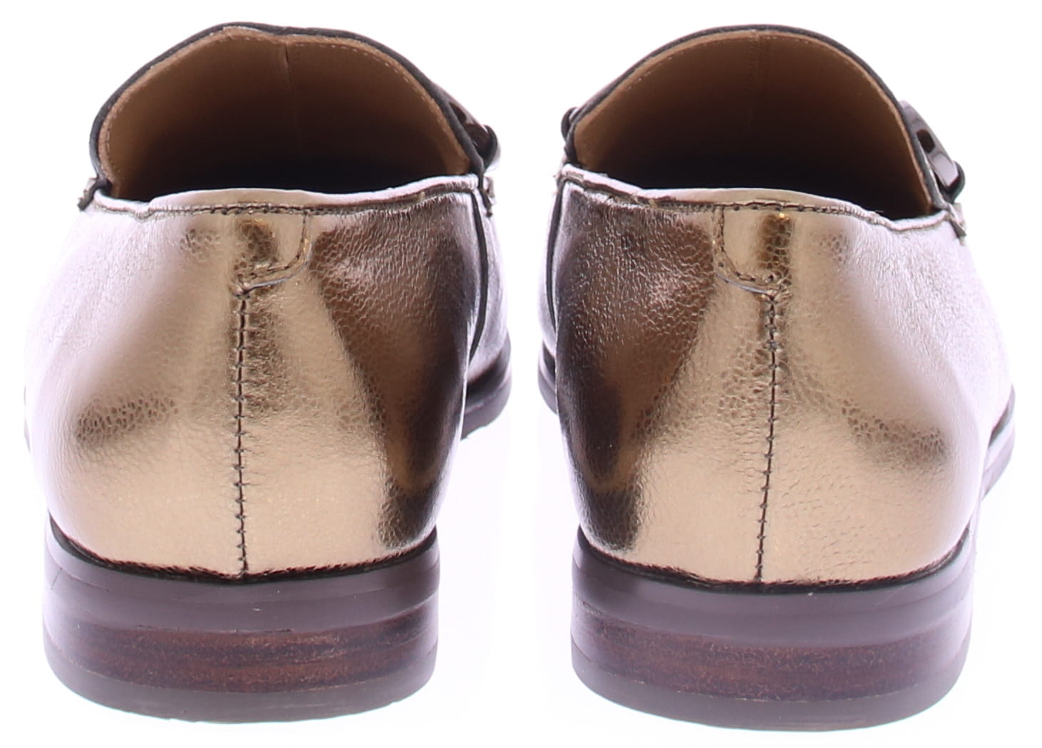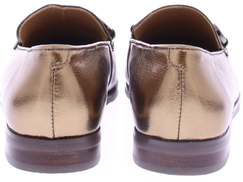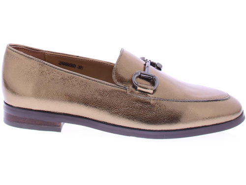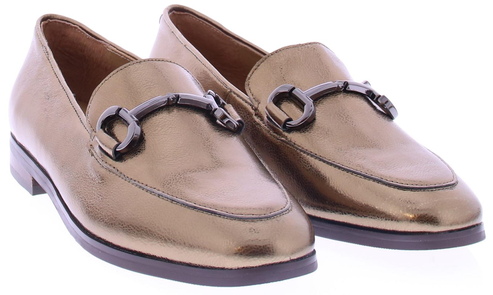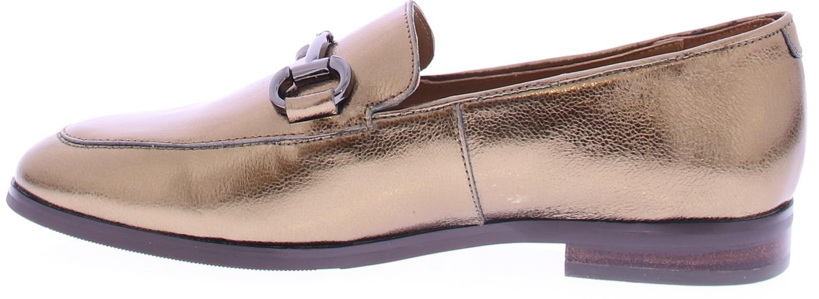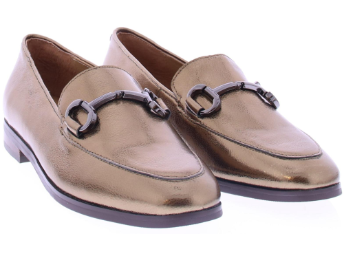 Bronskleurige dames instapper van Di Lauro. Deze instapper met een ovale leest heeft op de wreef een fijne nikkel kleurige bit. Dit model is leergevoerd, met een vast voetbed, en heeft een kunststof zool en een lage hak van 2 centimeter. Met deze mooie loafer geef je ieder outfit een chique uitstraling!