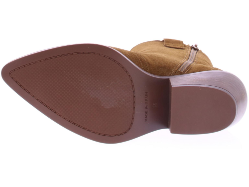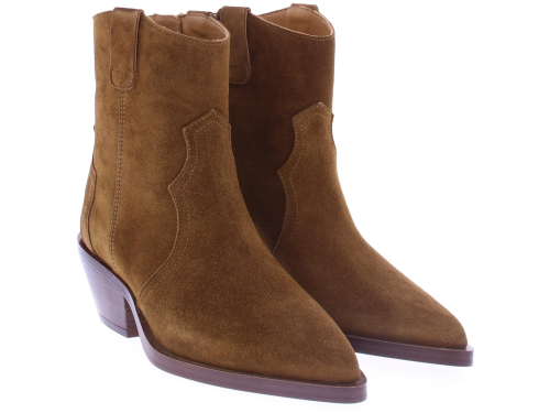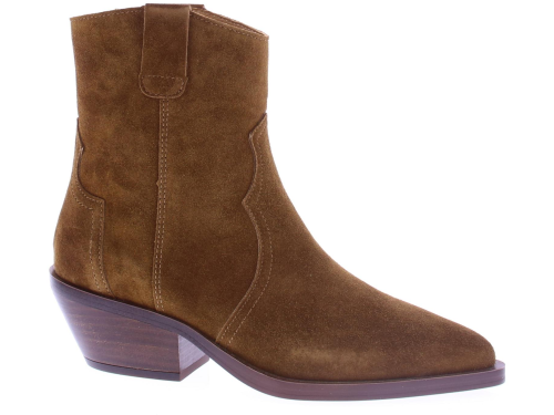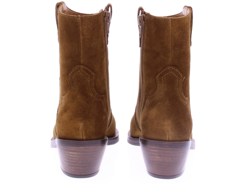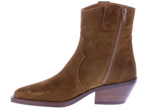 Middenbruin suede dames enkellaarsje van Alpe. Dit city western laarsje heeft een rits aan de binnenkant. De zool is van rubber en heeft een hakhoogte van 3 cm.