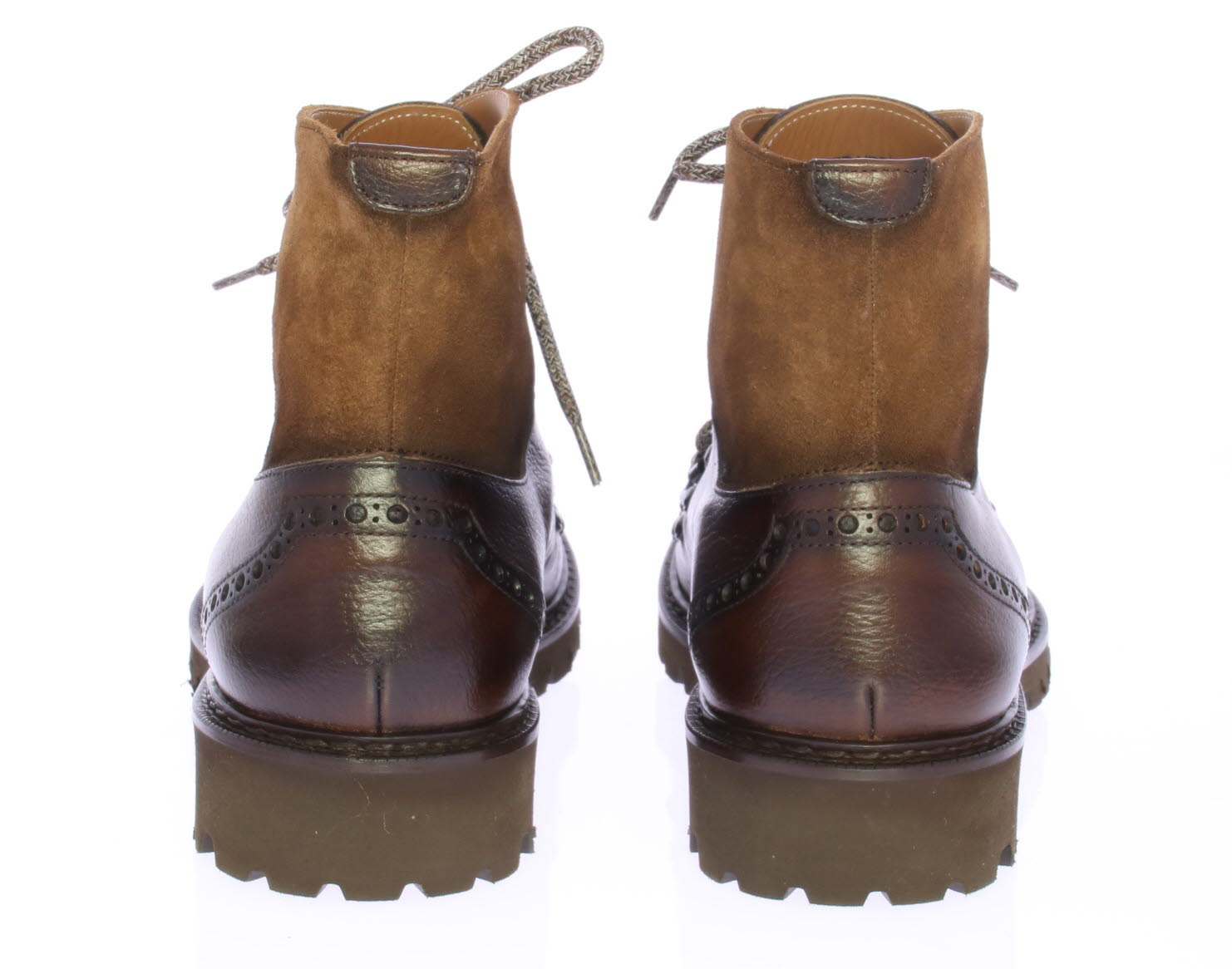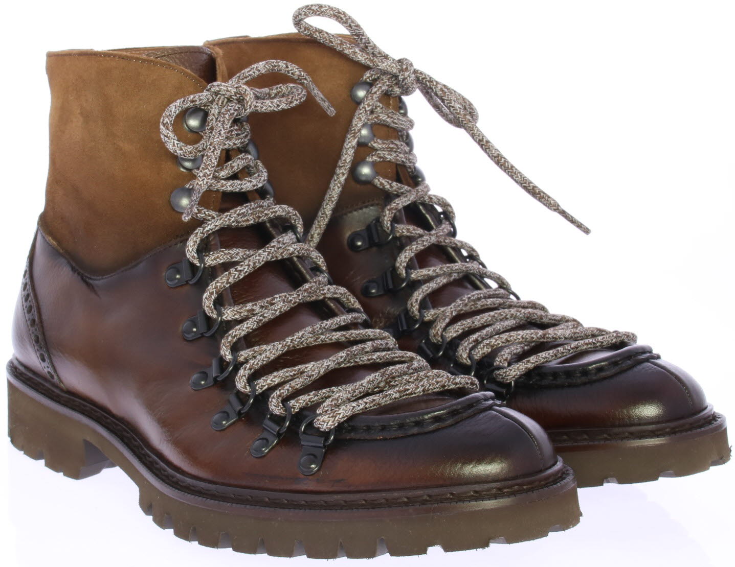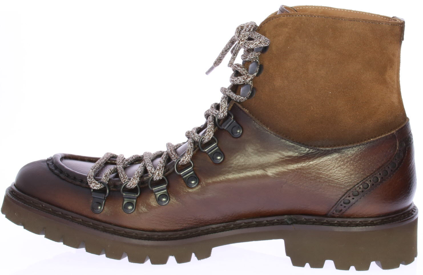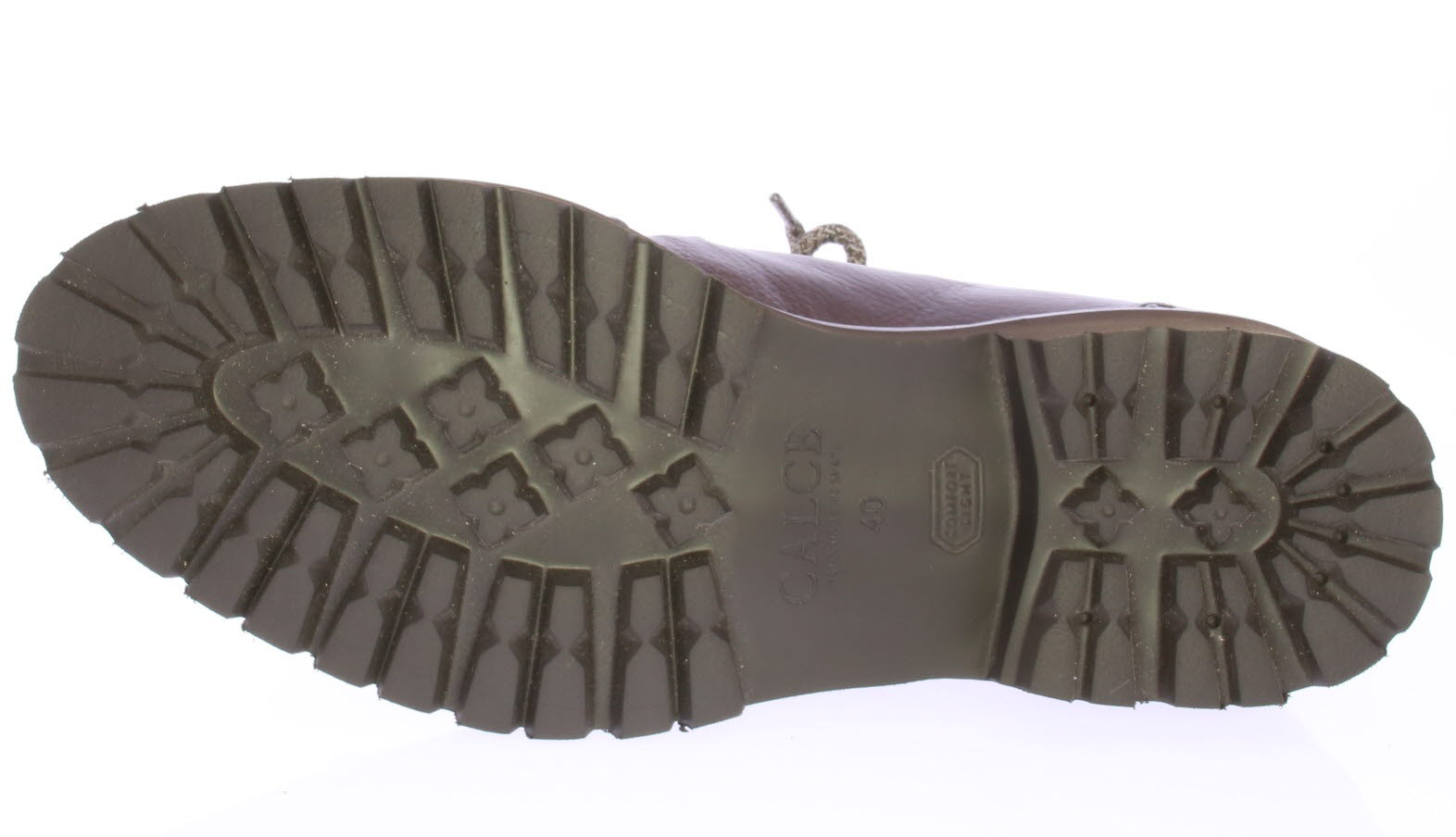 Bruine leren heren enkelboot van Calce. De boot heeft een grove spiegel op de neus en bergschoen haakjes. Het bovenwerk is van grainleer met suede schacht. De zool is van lichtgewicht rubber met profiel.