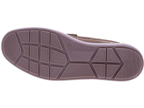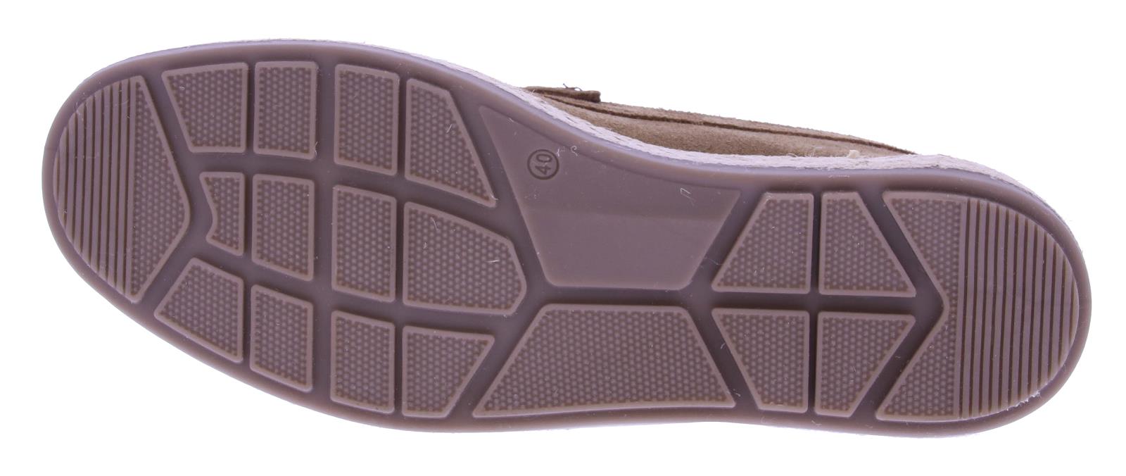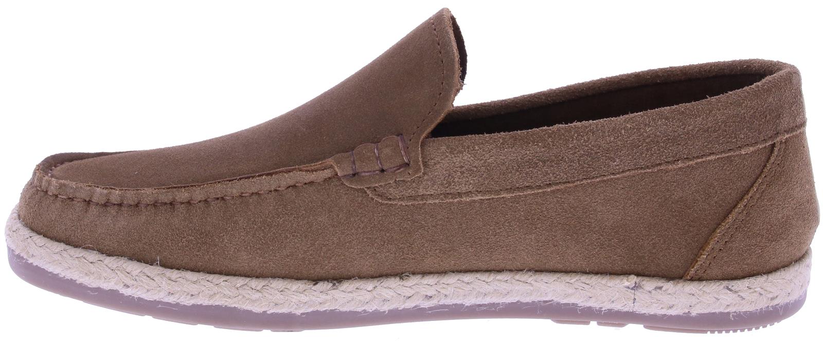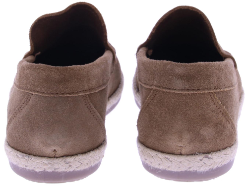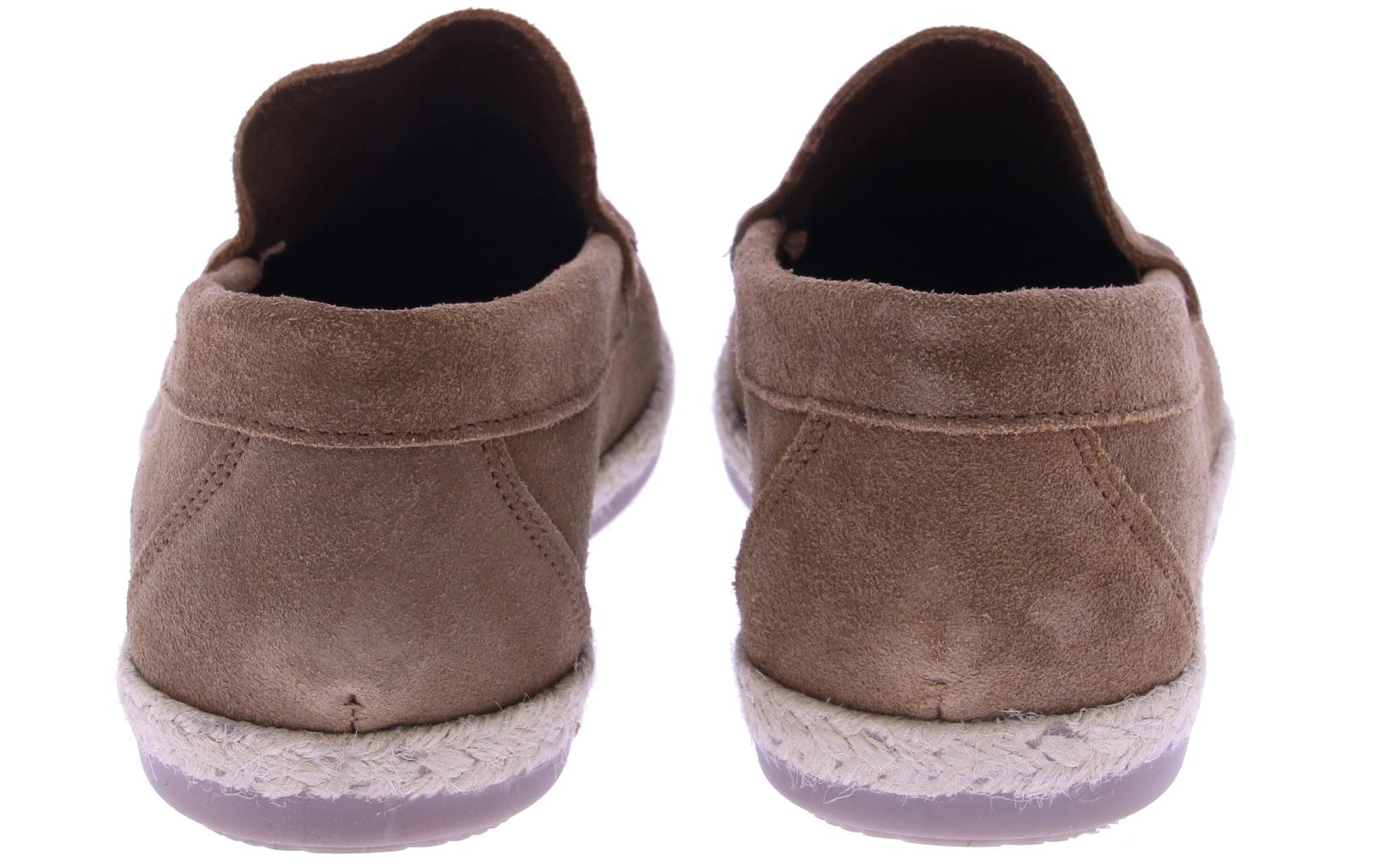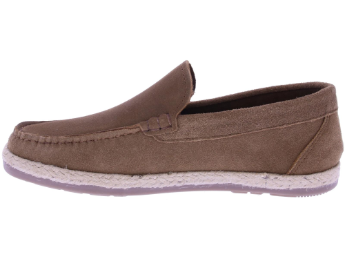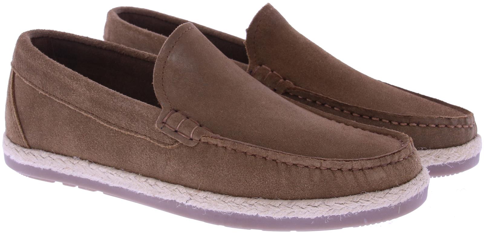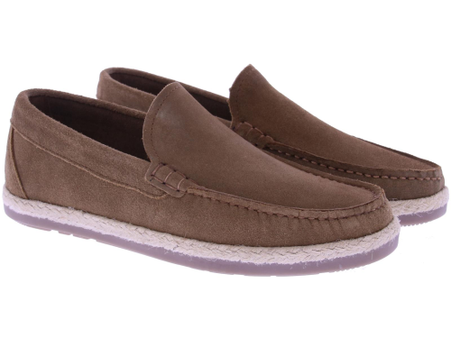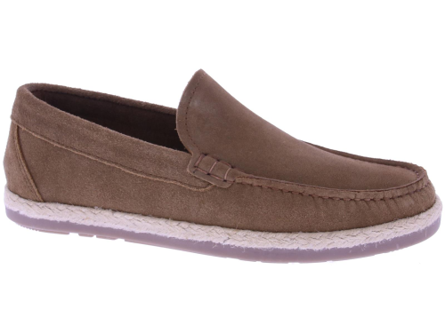 Zomerse suede middenbruin kleurige loafer op een rubberen zool. Met een touwrand langs de zool. De schoen is ongevoerd.