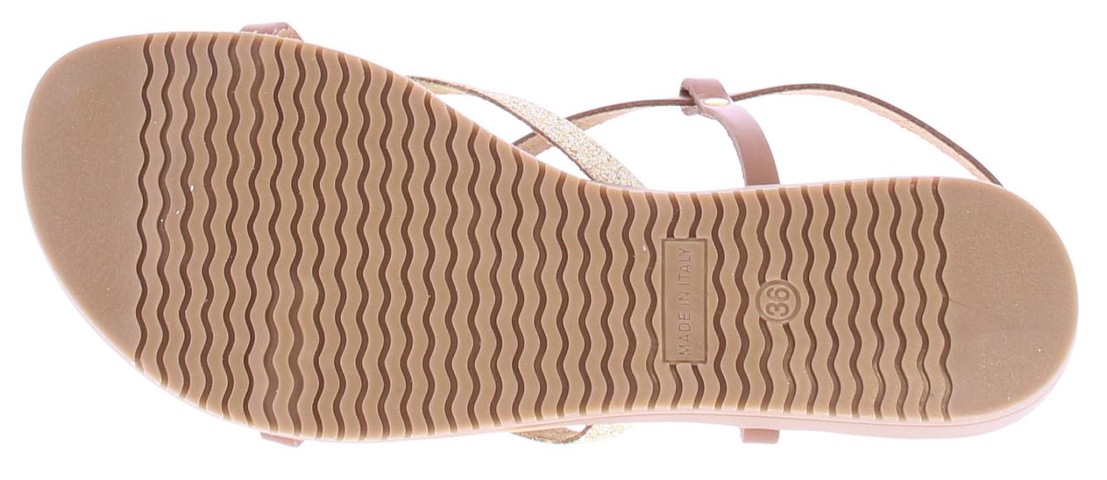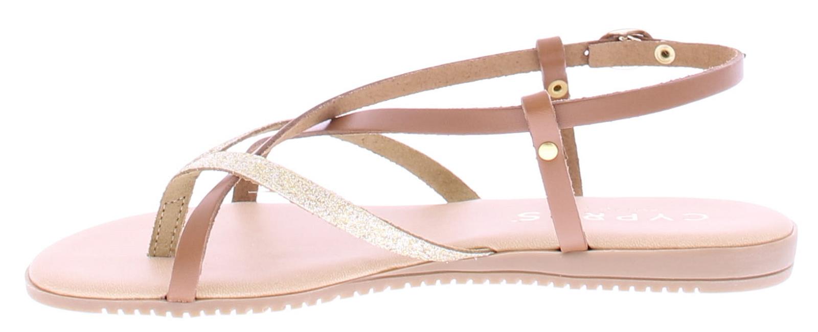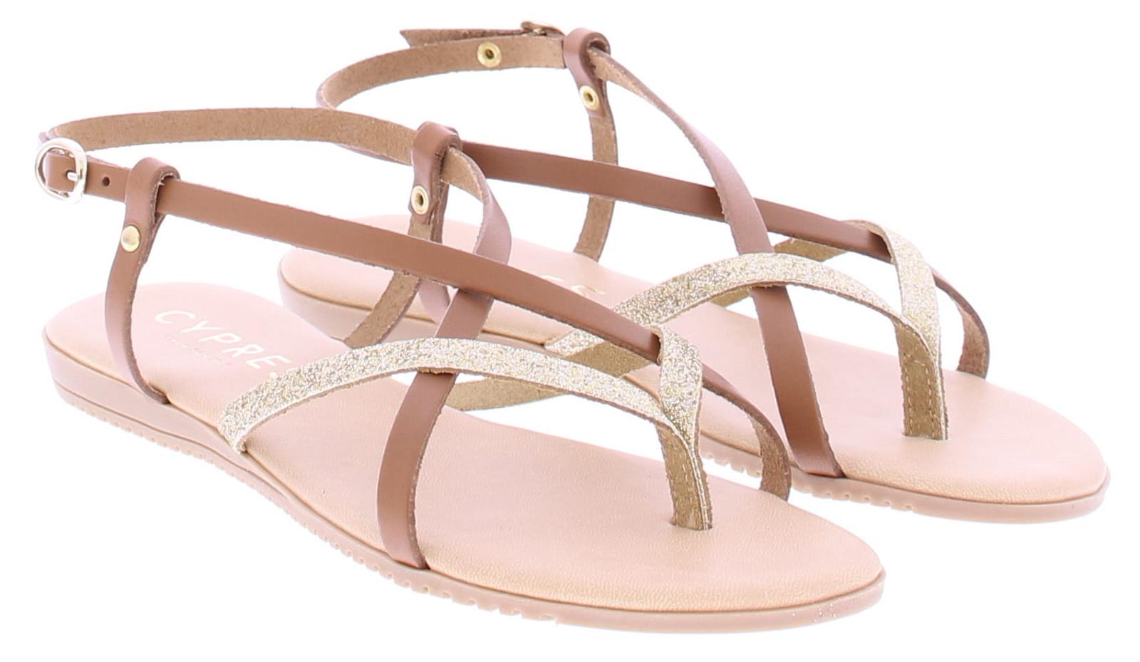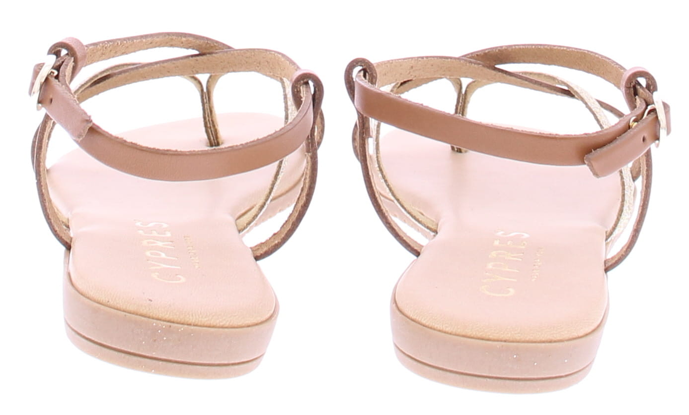 Bruin met goud leren teensandaal voor dames van Cypres. Deze sandaal heeft gekruiste leren bandjes over de voet en om de hiel een verstelbare gespsluiting. Het voetbed is van leer.
