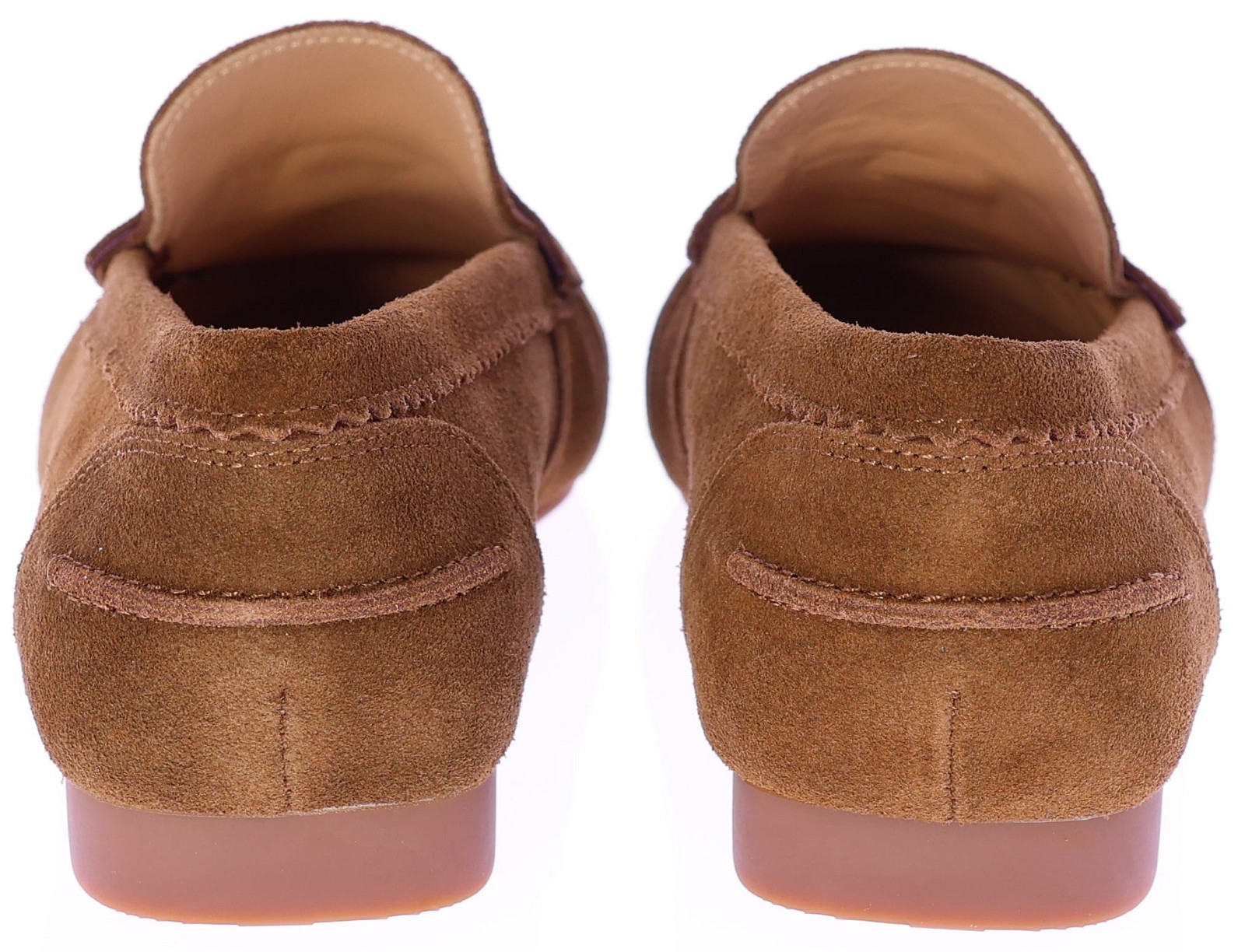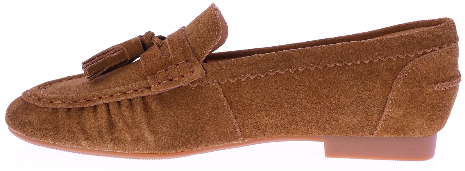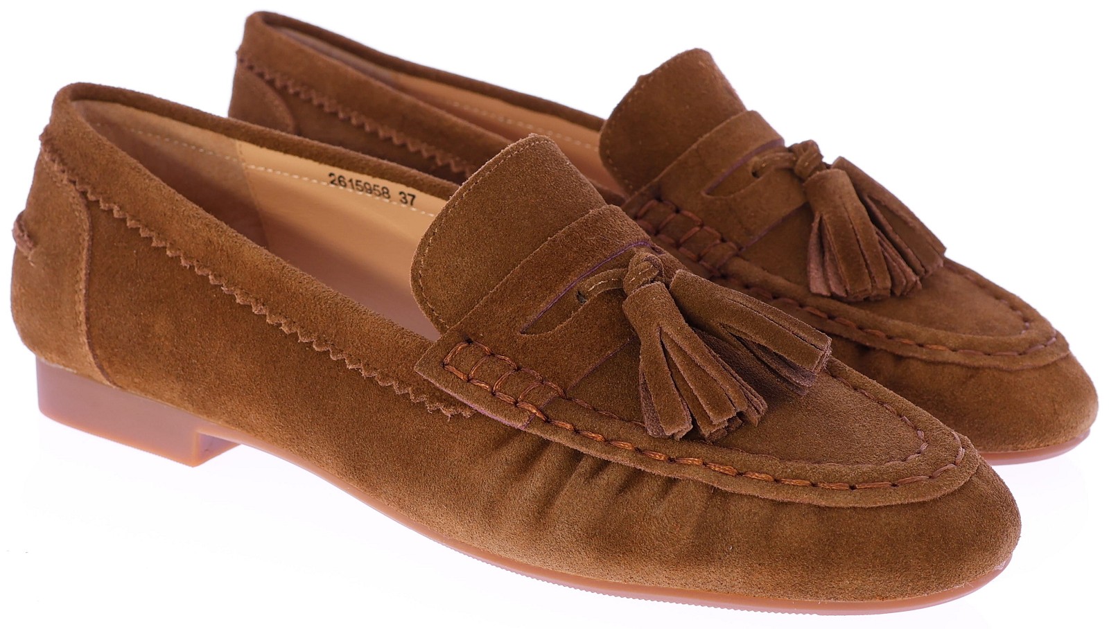 Bruin suède dames instappers van Di Lauro, model Diomede. Deze instapper heeft een klassieke mocassinbelijning en is afgewerkt met suède kwastjes op de wreef. Het zachte suède vormt prettig om de voet en de leren voering zorgt voor comfortabel dragen gedurende de dag. De rubberen zool biedt soepele ondersteuning bij dagelijks gebruik. Een tijdloos model dat moeiteloos te combineren is met zowel casual outfits als nette pantalons.