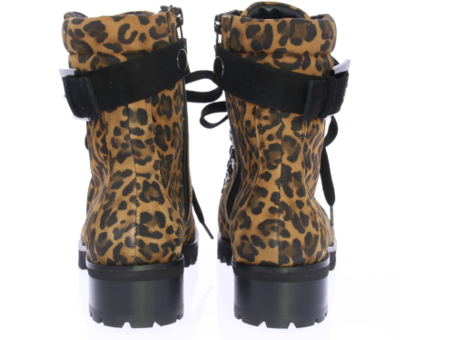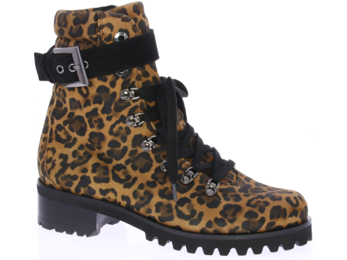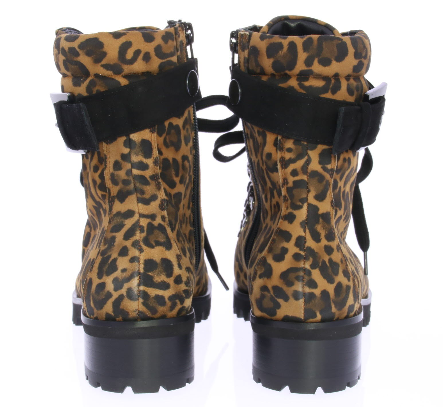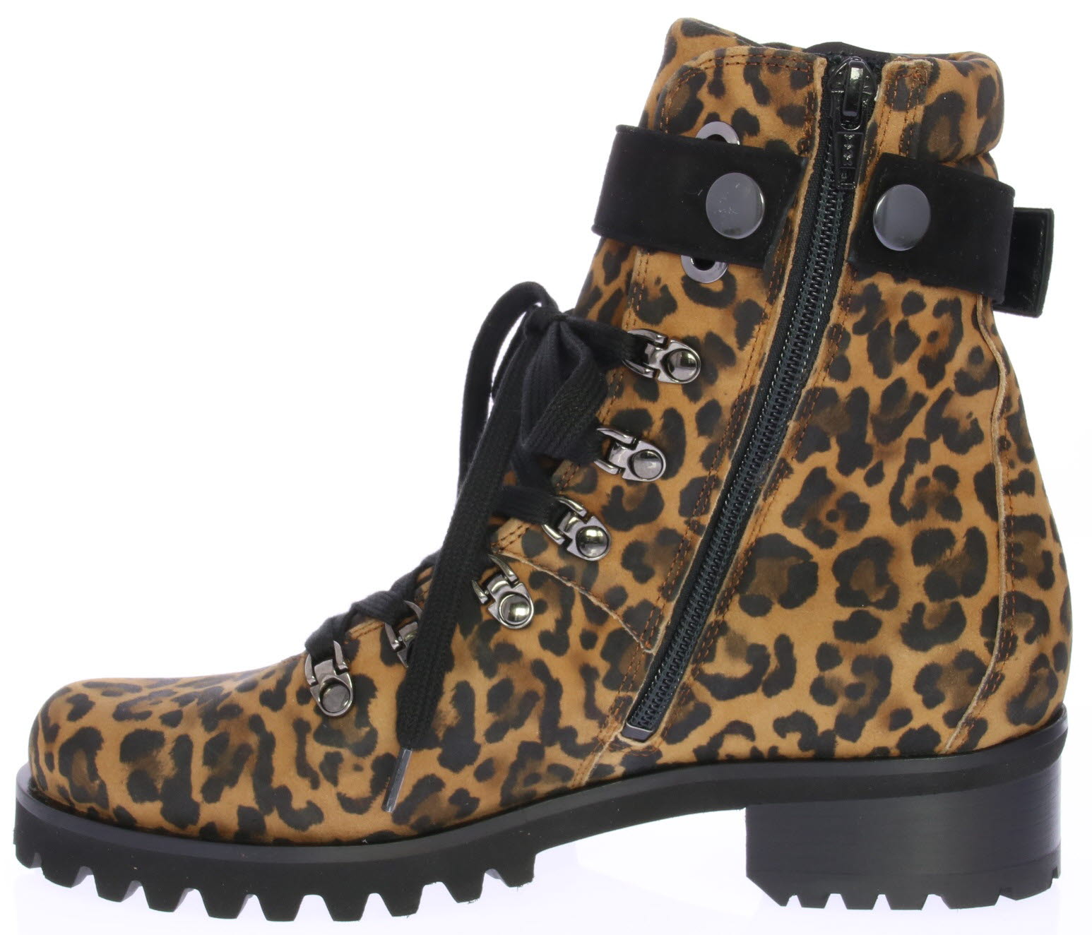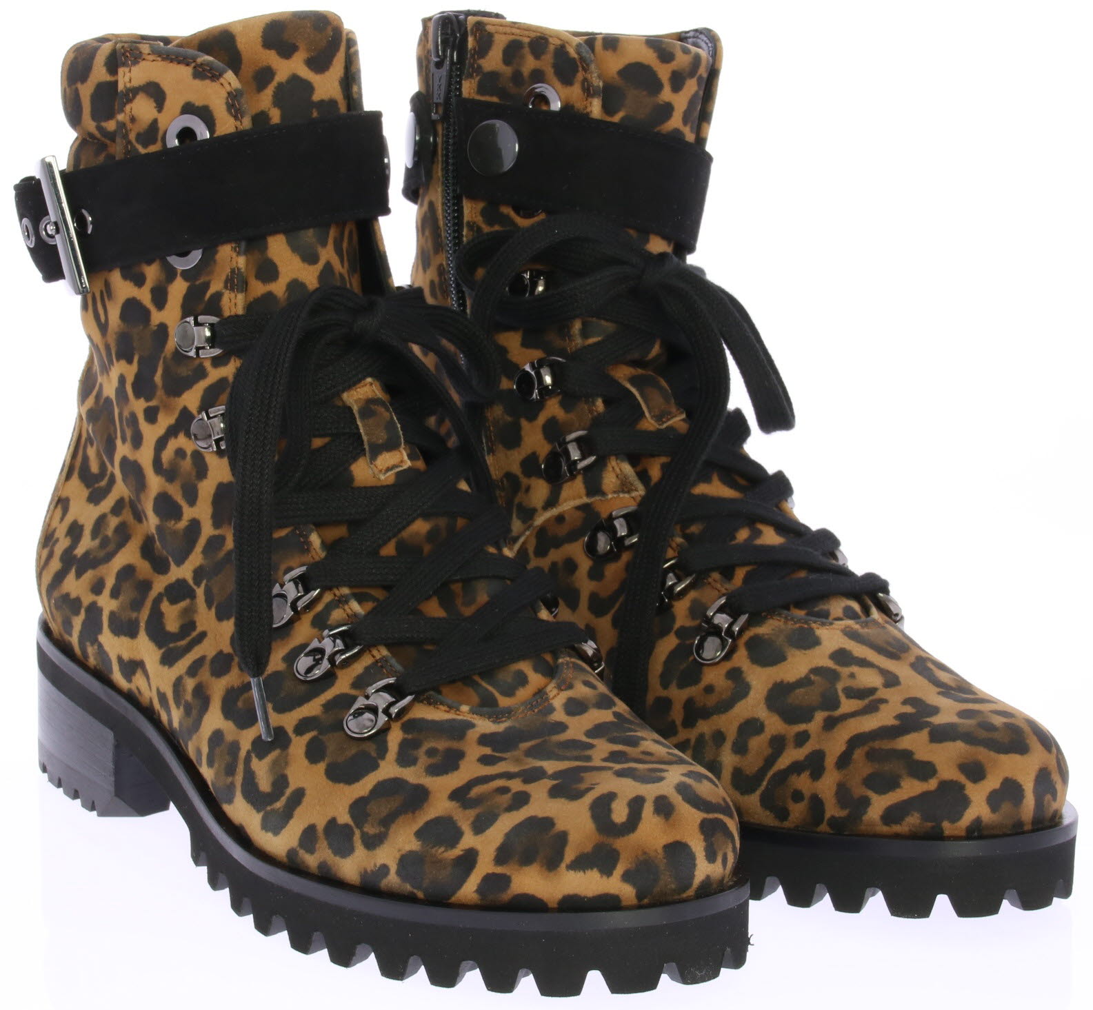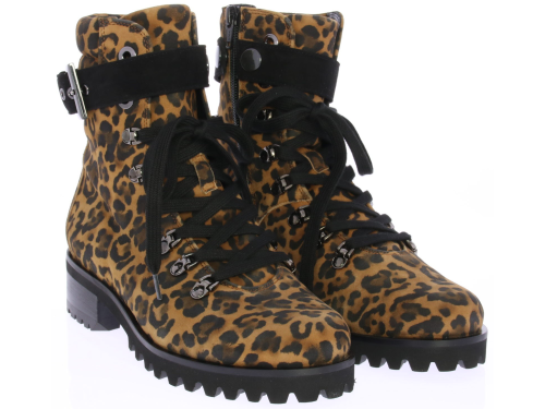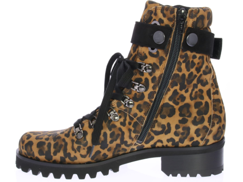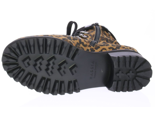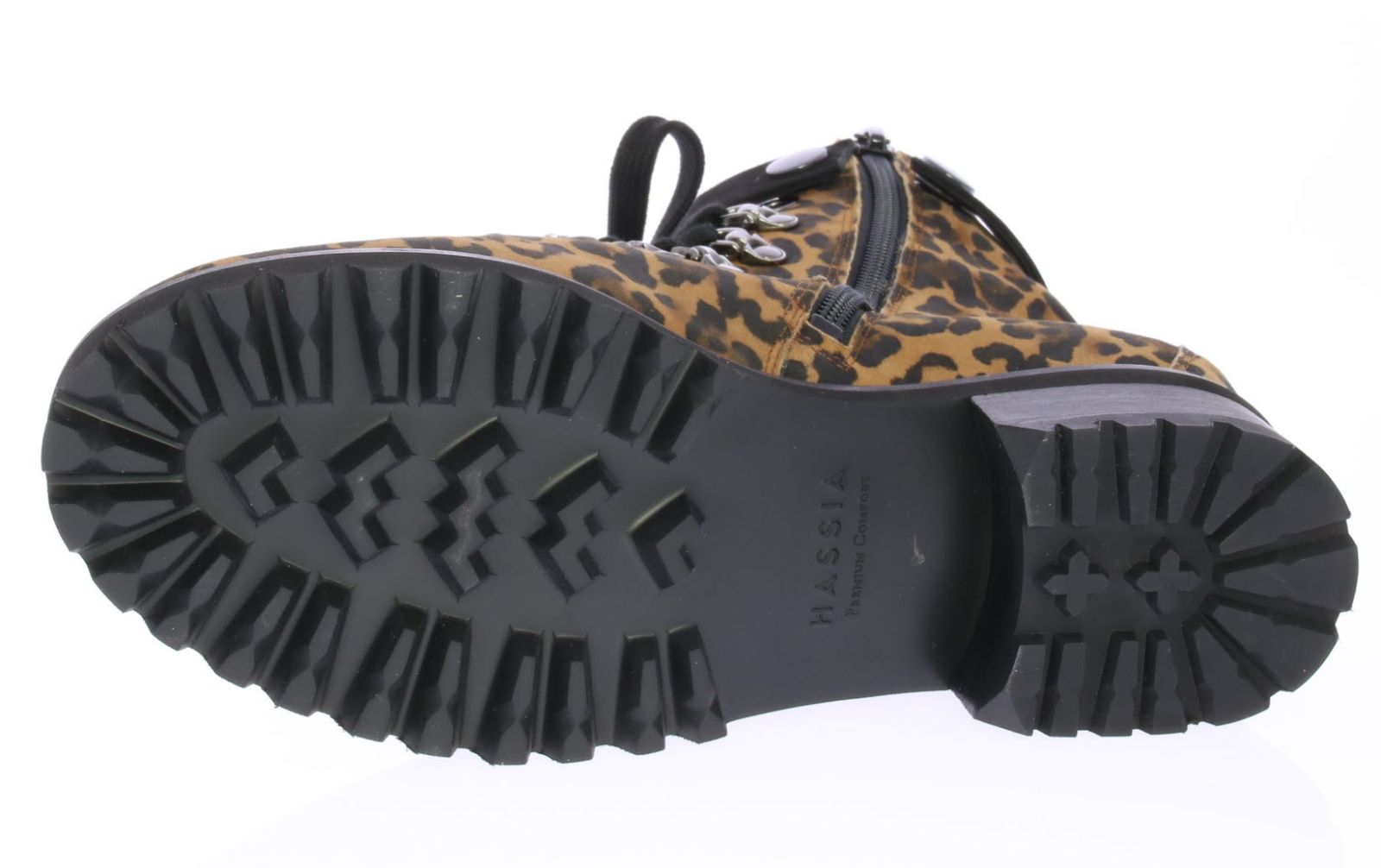 Camel/bruine panterprint suede dames veterboot van Hassia. De schoen heeft een bandje om de enkel wat ook kan worden verwijderd. De wijdte is H en het voetbed is uitneembaar.
